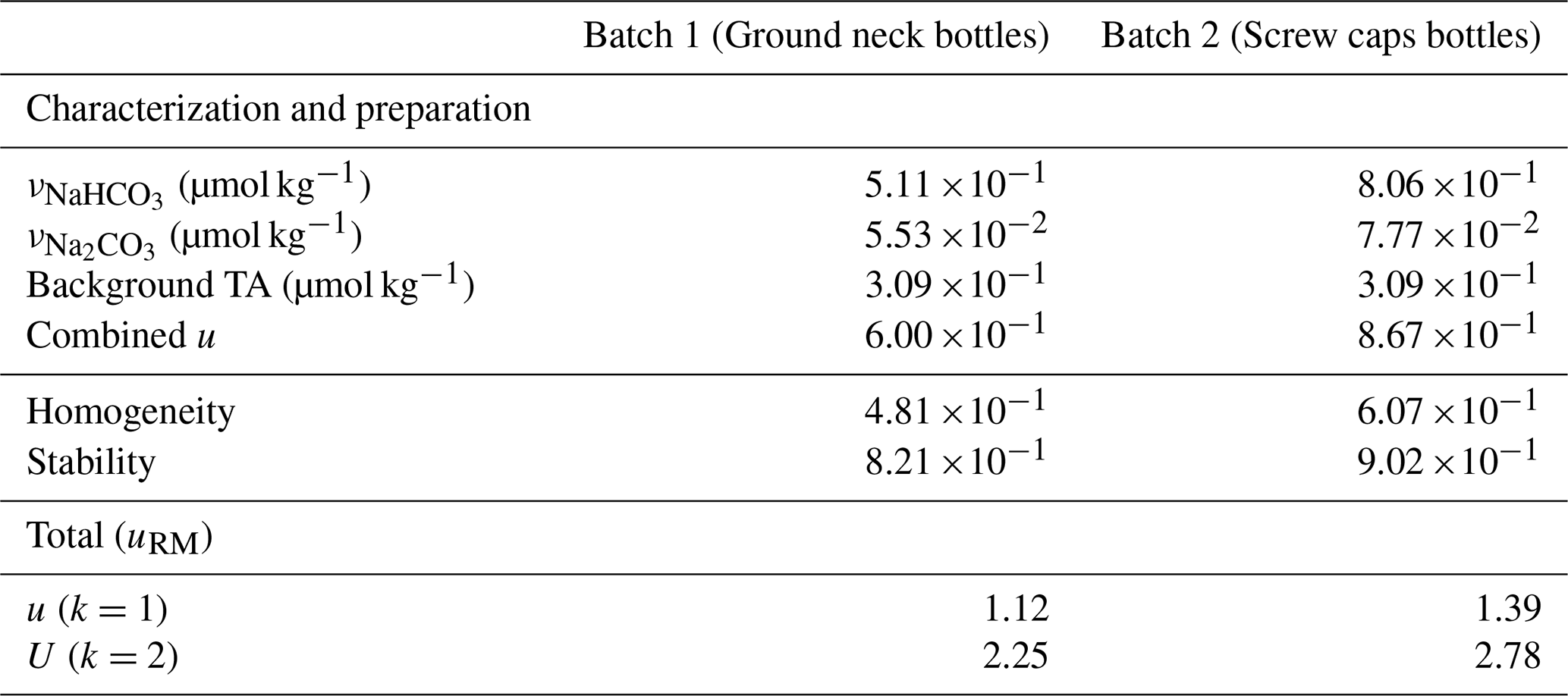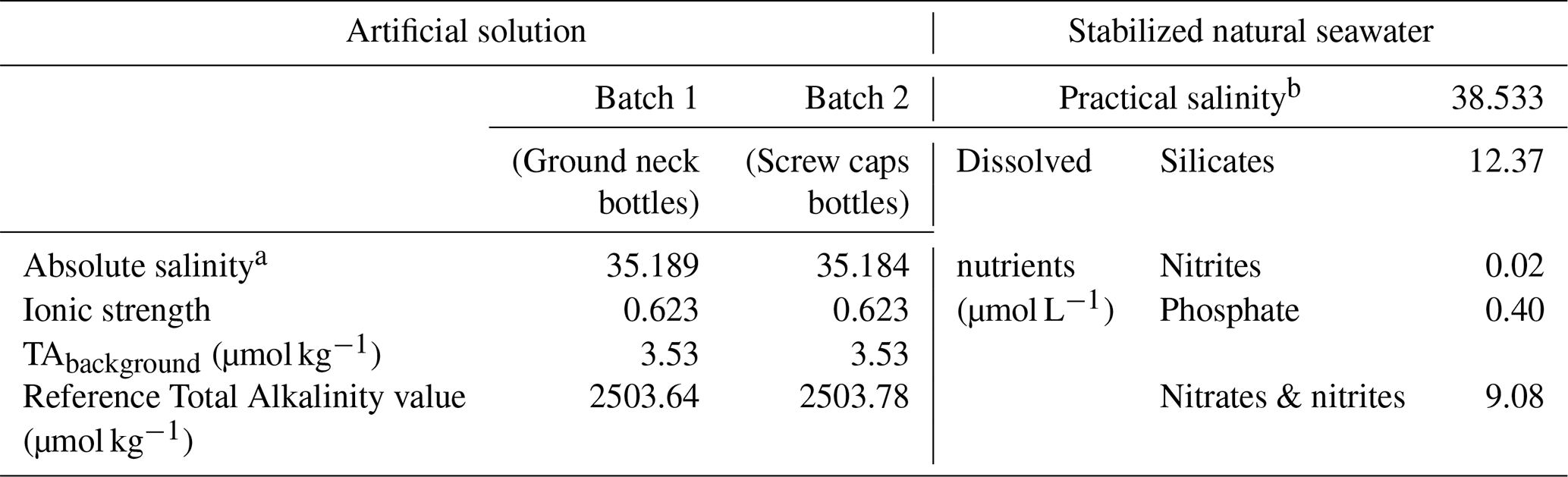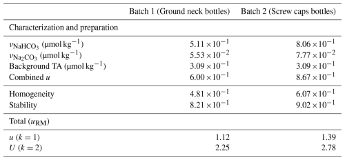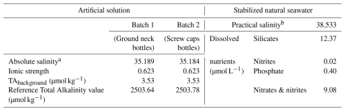 Table 2Characteristics of the produced reference materials for total alkalinity measurements.