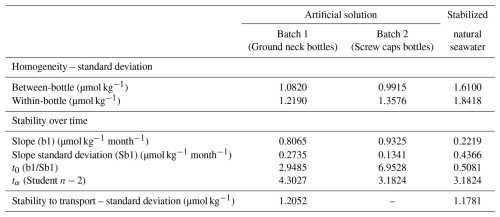 The between-bottle homogeneity of the Batch 2 of the artificial seawater was obtained from the standard deviation of the mean TA values of three different bottles, themselves computed from at least three repeatability measurements. These measurements were made at LNE, using the open-cell multi-step potentiometric titration method.