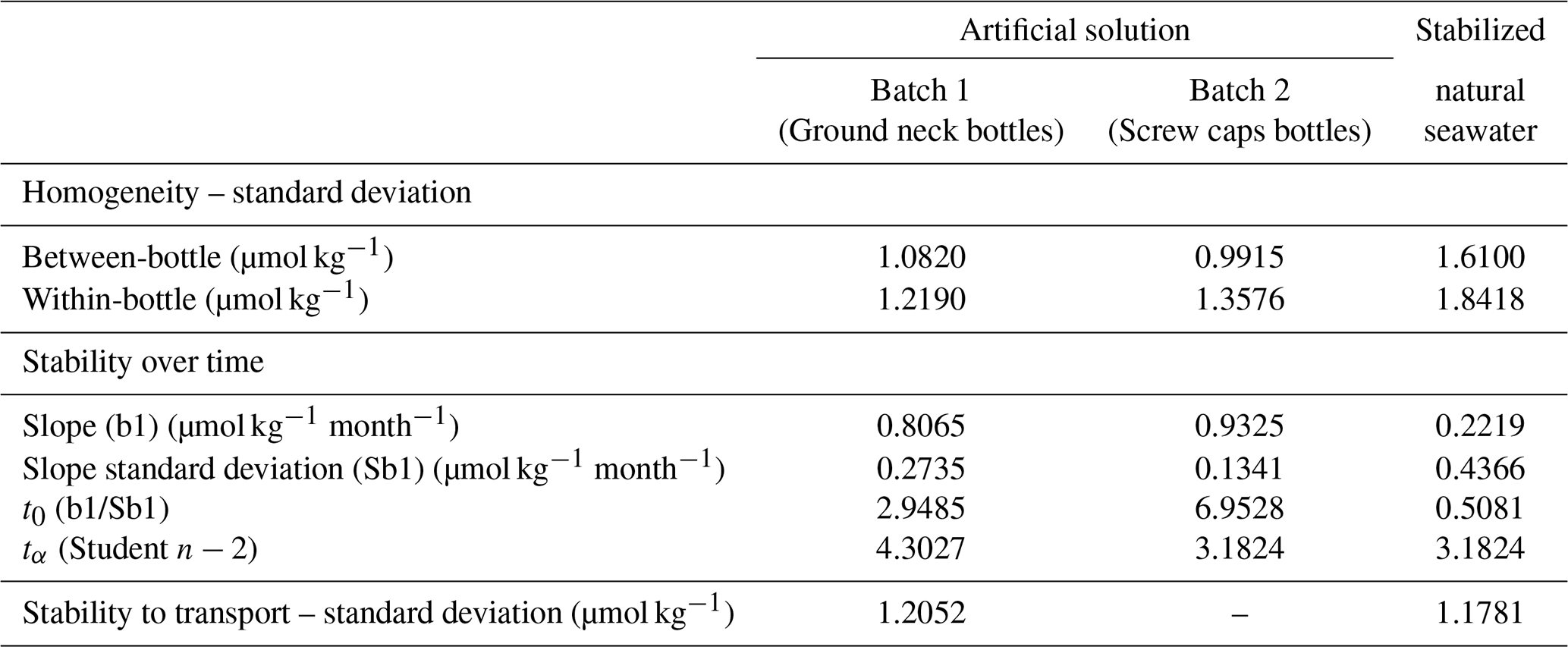 Between-bottle homogeneity of the stabilized natural seawater and of Batch 1 of the artificial seawater was computed from standard deviation of single measurements made consecutively on three bottles of the same batch. It was conducted with the closed-cell multi-step potentiometric titration method at the SNAPO-CO2.