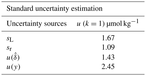Ensuring the quality of total alkalinity measurement results is of great importance. The Global Ocean Acidification Observing Network and the World Meteorological Organization have fixed a data quality objective corresponding to a standard uncertainty in total alkalinity measurement results of 2 and 1 µmol kg−1, respectively (GOA-ON, 2019; WMO et al., 2022). The GOA-ON value was chosen in order to obtain a 1 % standard uncertainty in the computation of the carbonate ion amount content variable, enabling to highlight climatic variations in the monitoring of ocean acidification.