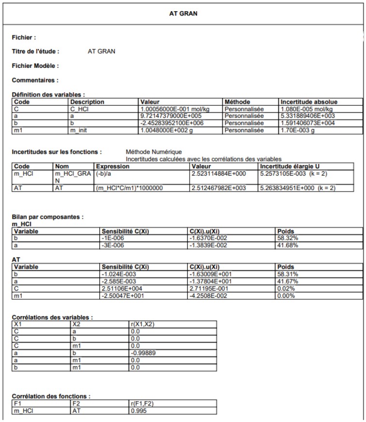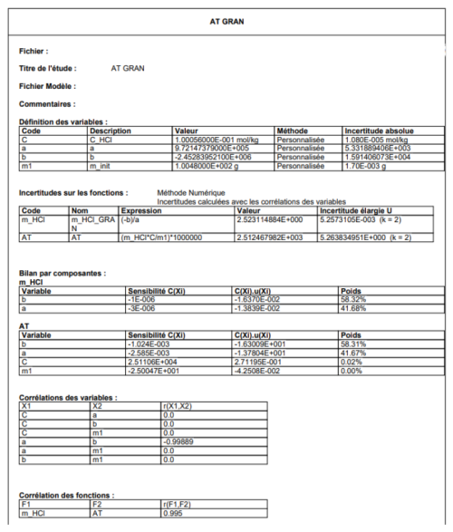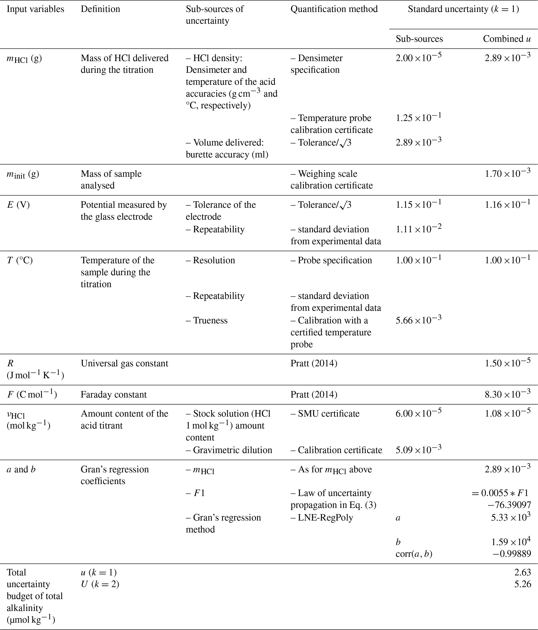 The measurement model of TA obtained from the titration curve using Gran's method (Gran, 1952) is presented below, and will be used for the establishment of the uncertainty budget.