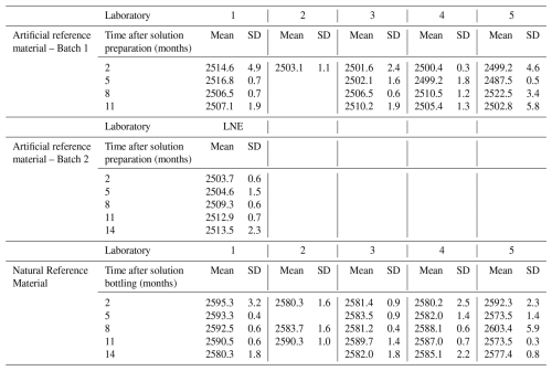 Table C1Total Alkalinity measurement results of all participants to the inter-laboratory comparison (µmol kg−1), including the stability monitoring over time. The “Mean” corresponds to the mean value of replicates, with standard deviation reported as “SD”.