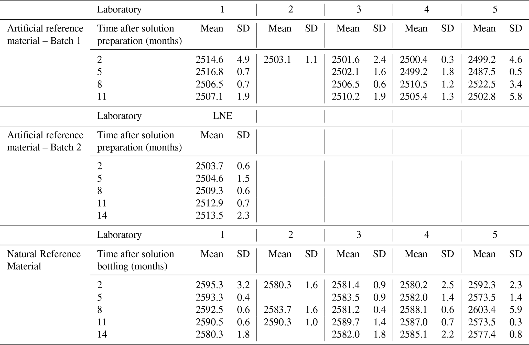 The stabilized natural seawater and Batch 1 of the artificial solution were distributed to be studied in the inter-laboratory comparison described in Sect. 4. The Batch 2 of the artificial seawater was analysed at LNE, with the objective of comparing the stability of the material for the two methods of bottling.