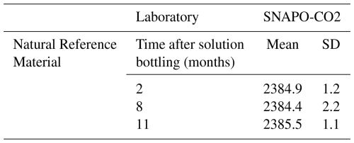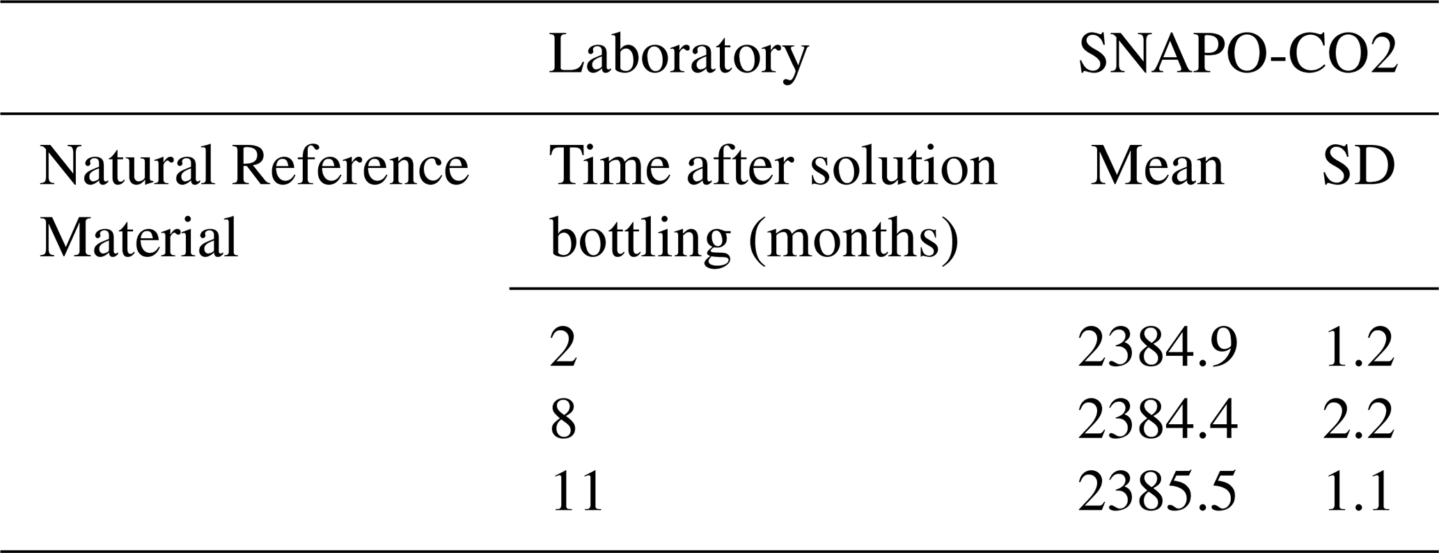 Table C2Dissolved Inorganic Carbon measurement results performed at the SNAPO-CO2 (µmol kg−1), including the stability monitoring over time. The “Mean” corresponds to the mean value of replicates, with standard deviation reported as “SD”.
