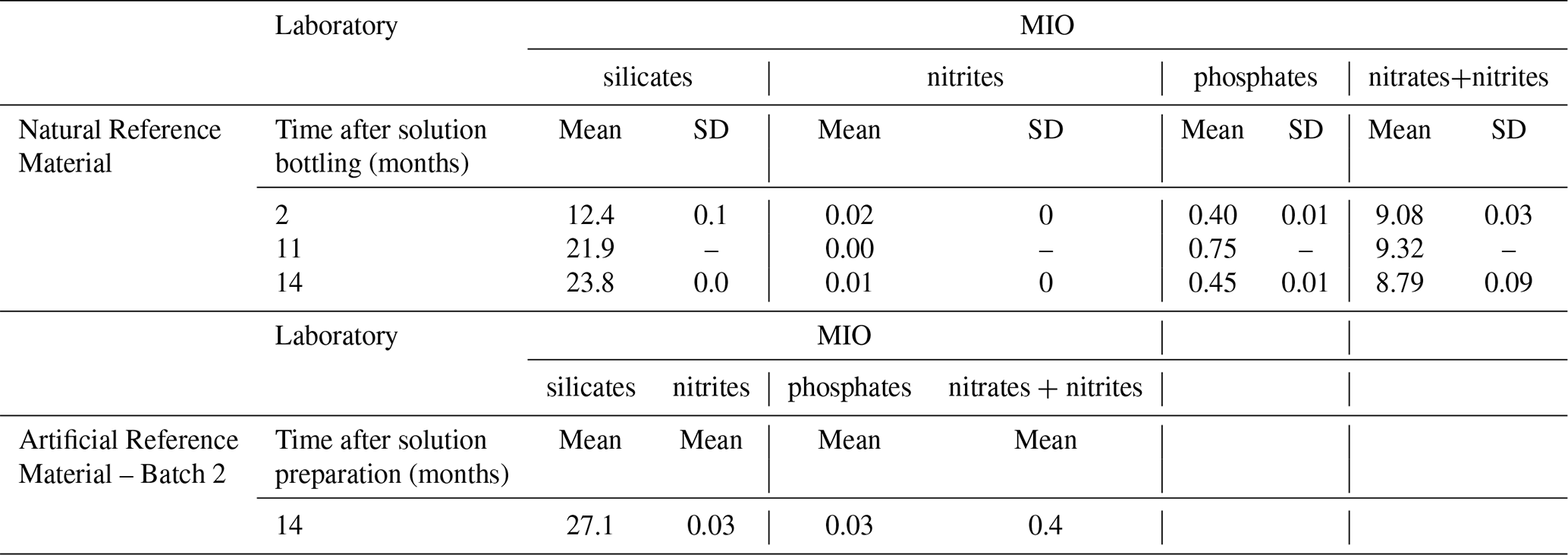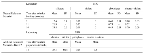 Dissolved nutrients of the stabilized natural seawater and of Batch 1 of the artificial seawater were also analyzed at the end of the stability study to highlight an eventual evolution.