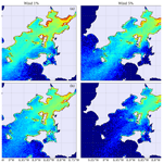 When the wind coefficient increases to 5 %, the overall particle concentration is reduced in the inner region and the accumulation becomes more diffuse, particularly during summer given that the north winds blow the particles out of the estuary. Particles generally drift towards southern regions with increased windage. Beached particles have not been taken into account when creating the concentration maps since they would distort the particle concentration in the sea. These results highlight the significant seasonal and geographical fluctuations in particle retention caused by wind forcing.