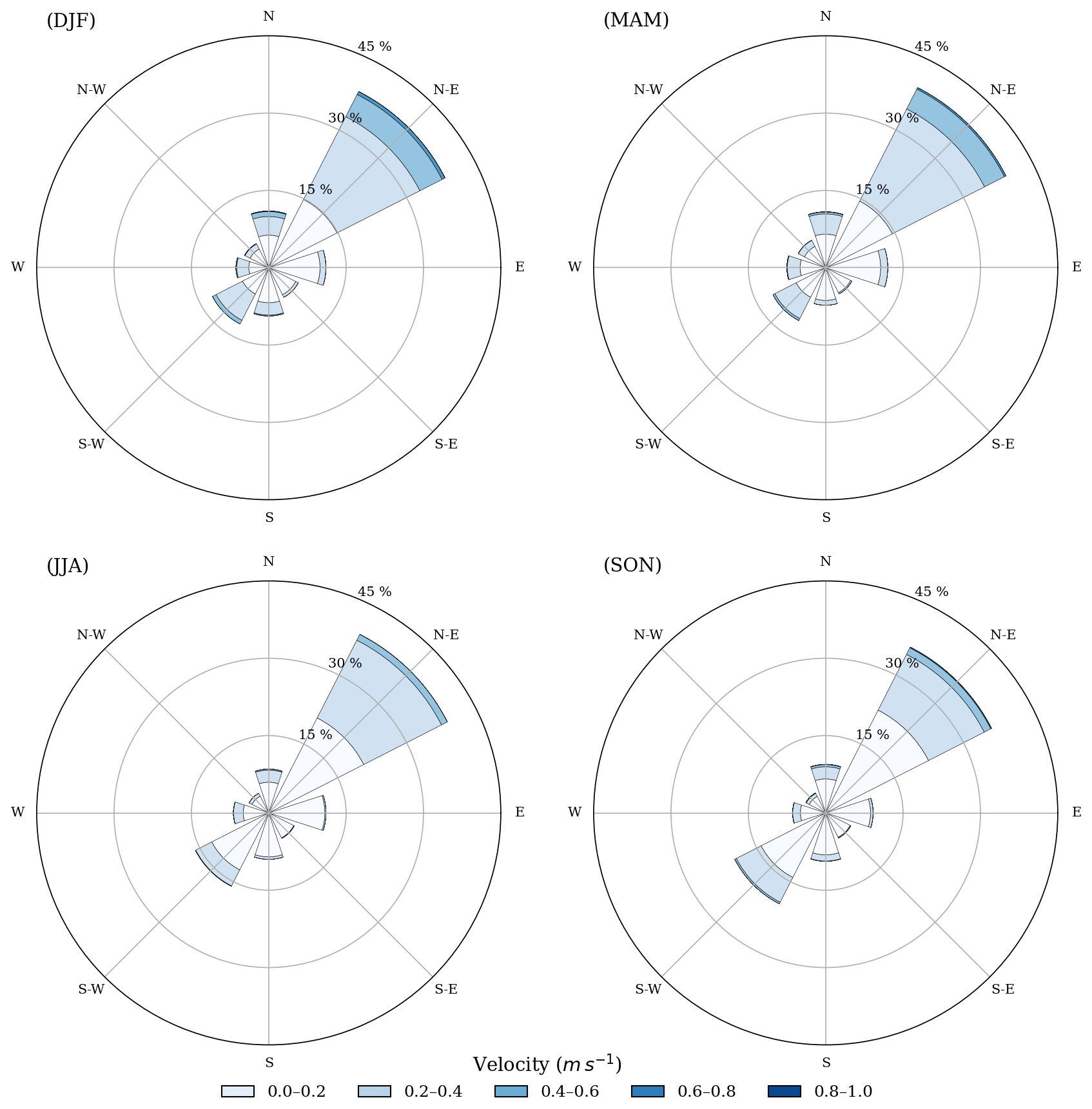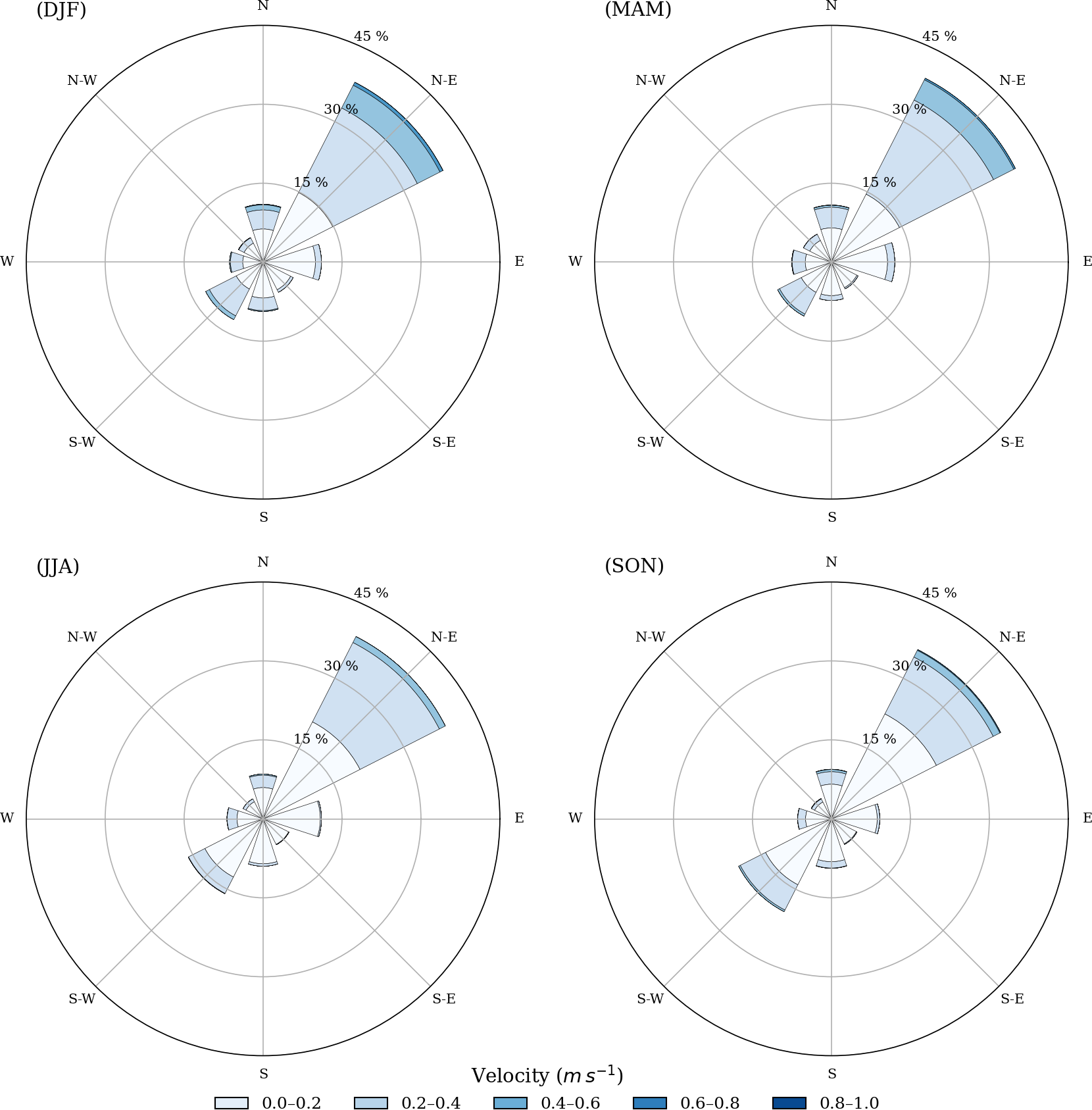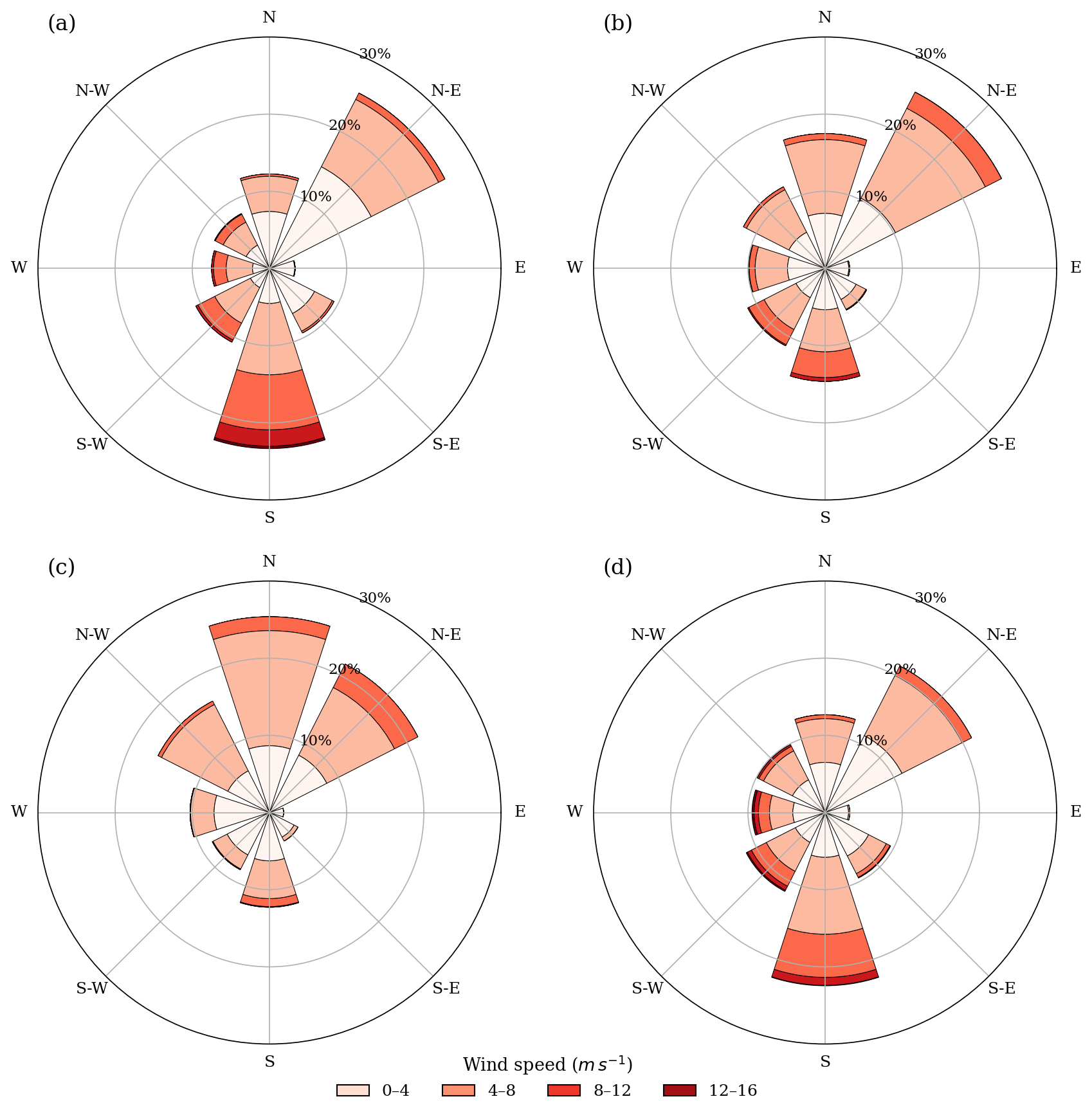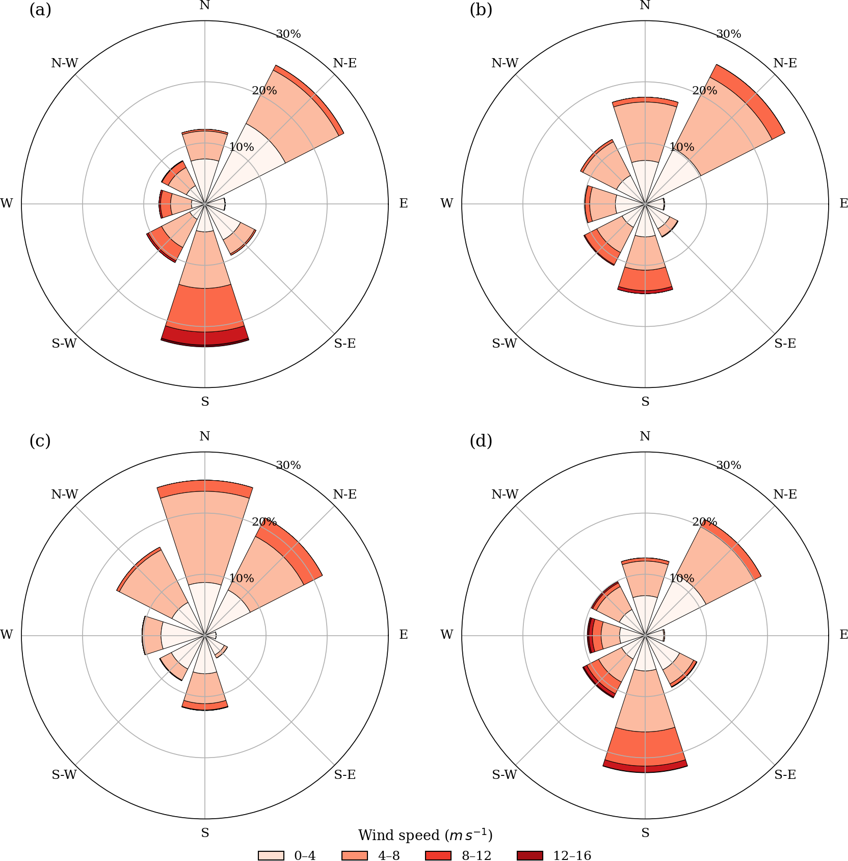 Figure 2Wind roses for the Ría de Arousa for winter DJF (a), spring MAM (b), summer JJA (c), and autumn SON (b) months.