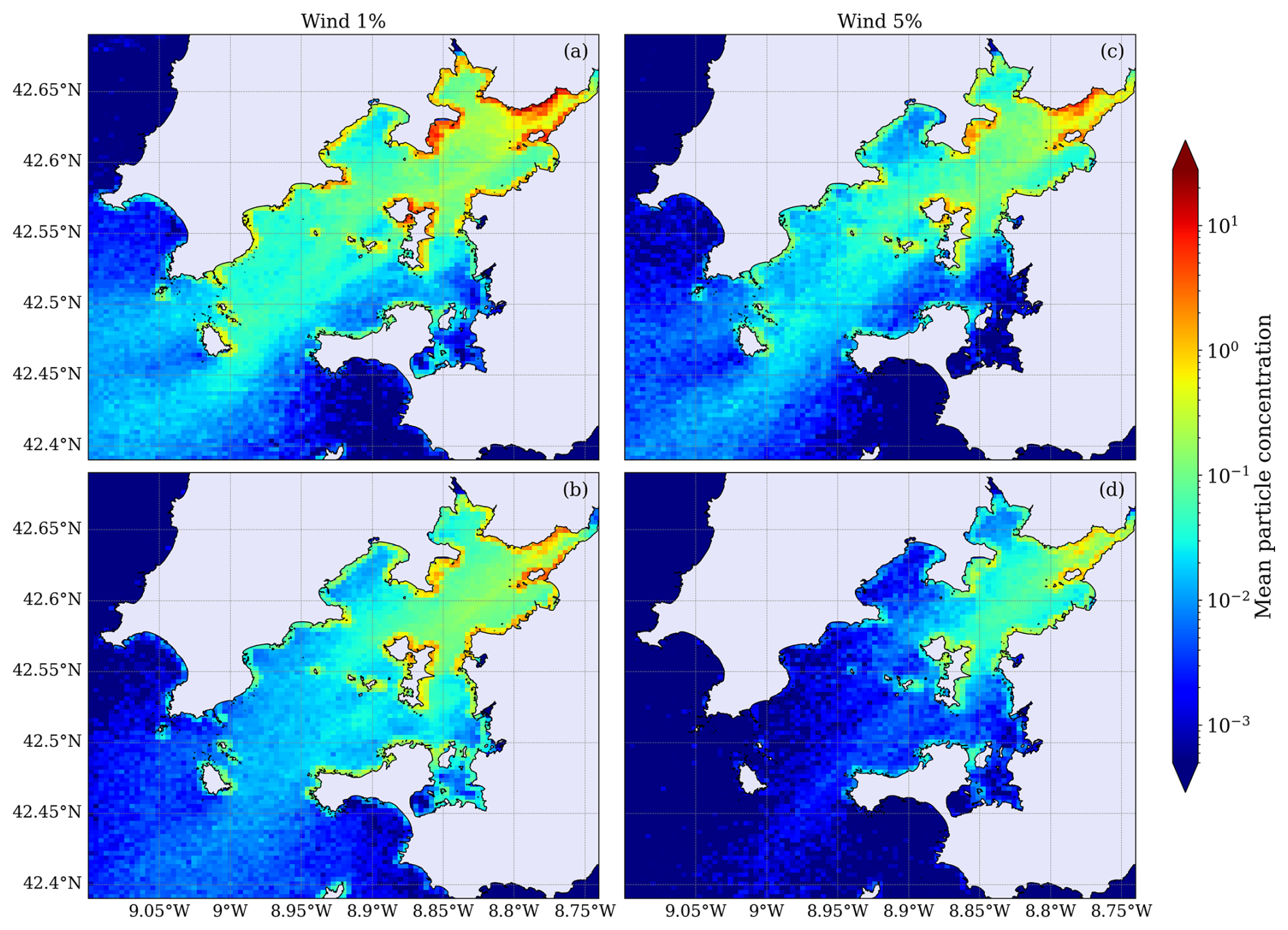Figure 3Mean particle concentration distributions in the Ría de Arousa for winter (DJF; panels a and c) and summer (JJA; panels b and d) seasons, based on Lagrangian simulations using wind drag coefficients of 1 % (left panels) and 5 % (right panels). Color shading represents the logarithmic scale of mean particle concentration.