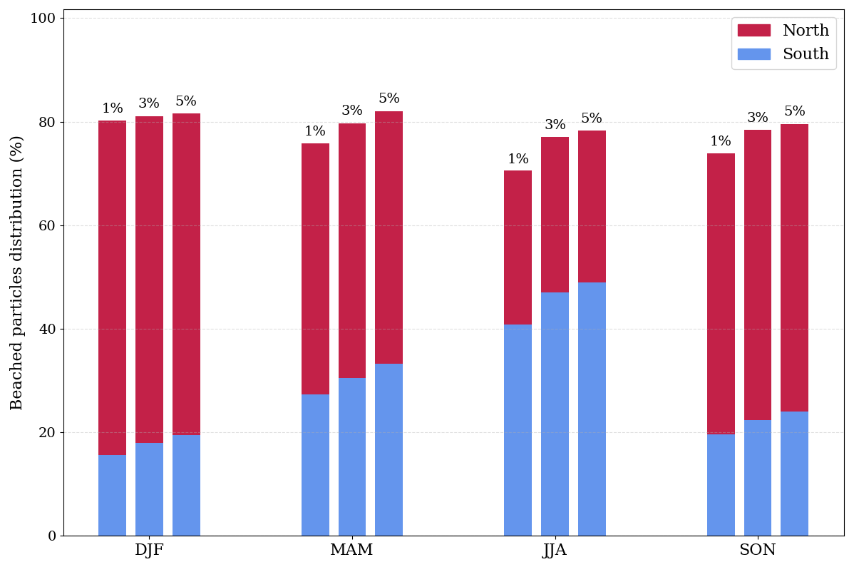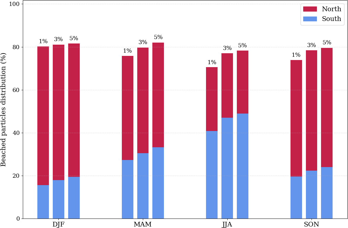 Beached particle distribution in the northern (red bars) and southern (blue bars) coasts of the Ría de Arousa for winter (DJF), spring (MAM), summer (JJA), and autumn (SON), for three different wind drag coefficients: 1 %, 3 %, and 5 % is shown in Fig. 4 as the percentage of beached particles out of all emitted in each season. A somewhat higher relative beaching is the result of higher wind coefficients. Throughout the winter and fall, higher populations are regularly seen along the northern coast. On the other hand, beaching along the southern coast grows and sometimes reaches the level of beaching in the north during the warmer months (JJA).
