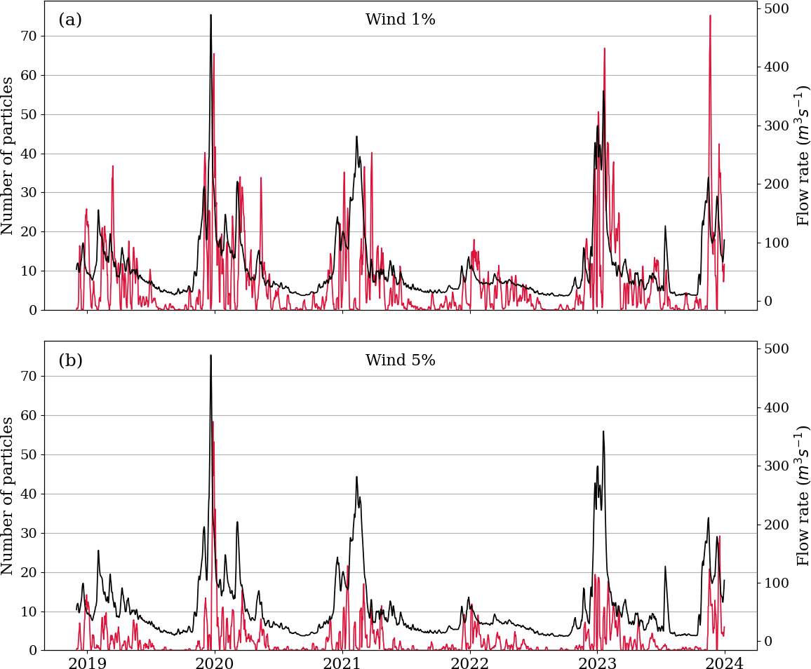 Figure 5Daily time series of number of beached particles for Ladeira beach (red) and Ulla river flow rate (black), for 1 % wind (a) and 5 % wind (b).