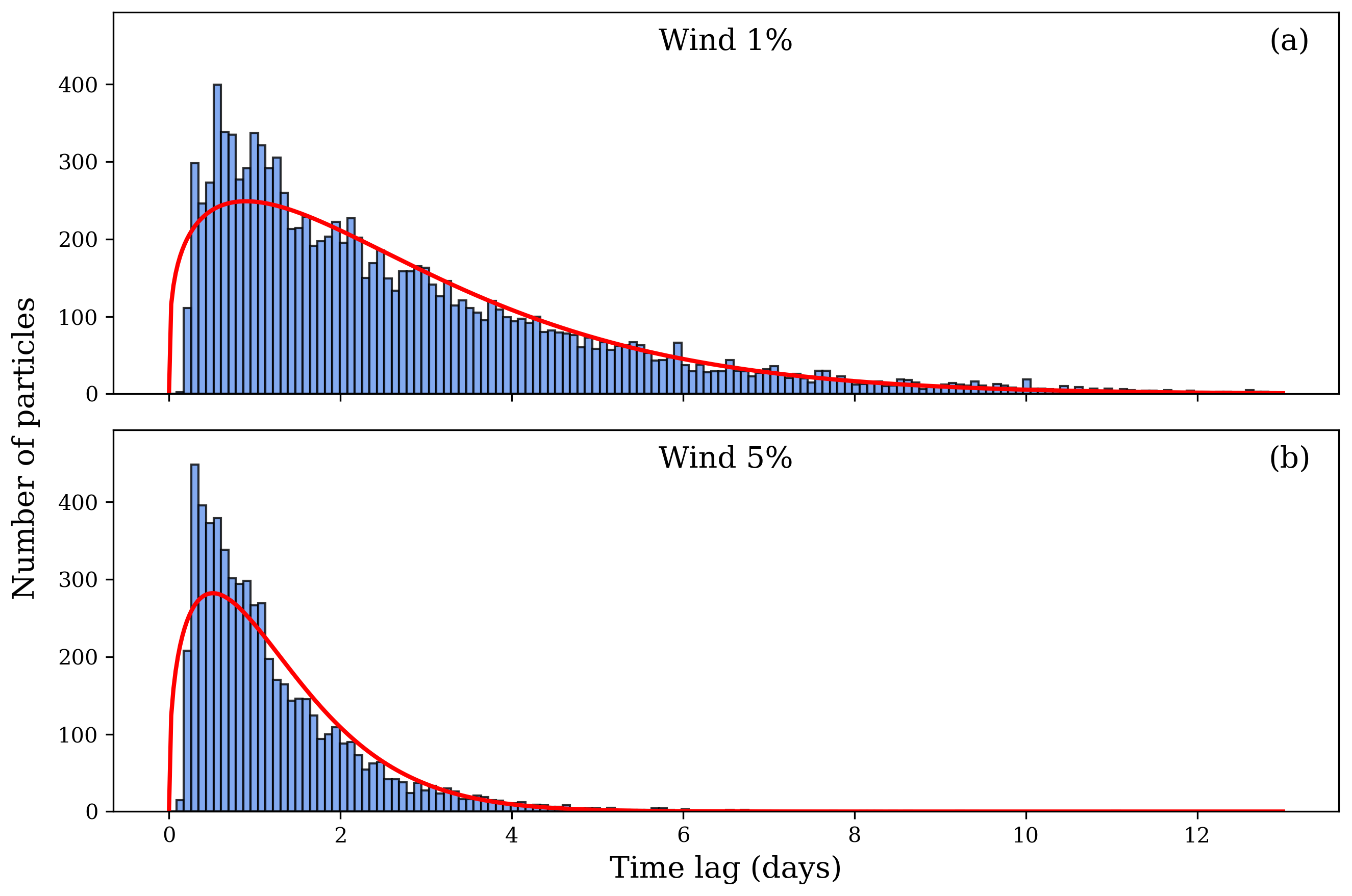 Figure 6Distribution of particle time lags beached at Ladeira beach (ID = 7) for 1 % (a) and 5 % (b) coefficient winds. Time lag data were fitted to a Weibull probability distribution (red line).