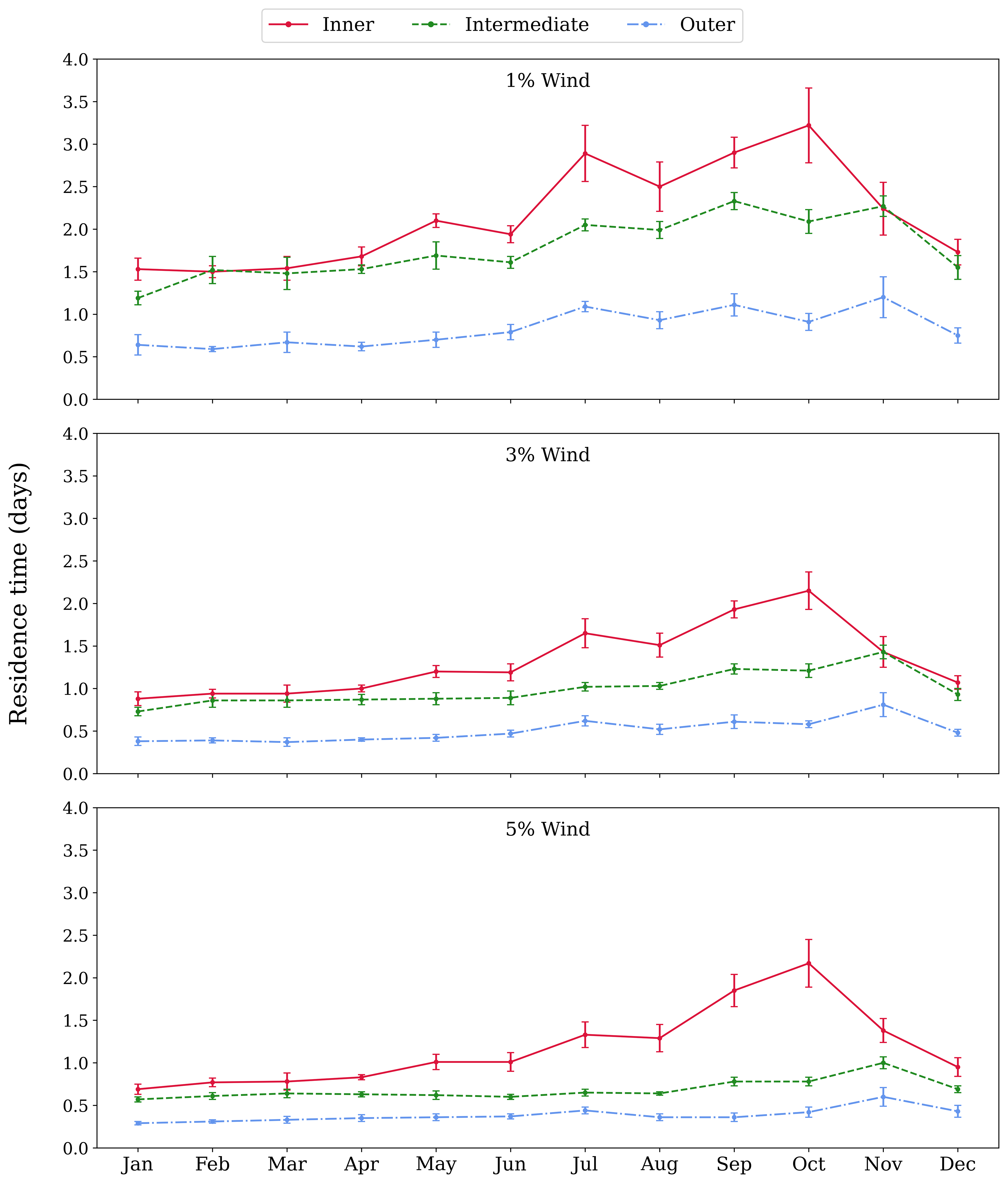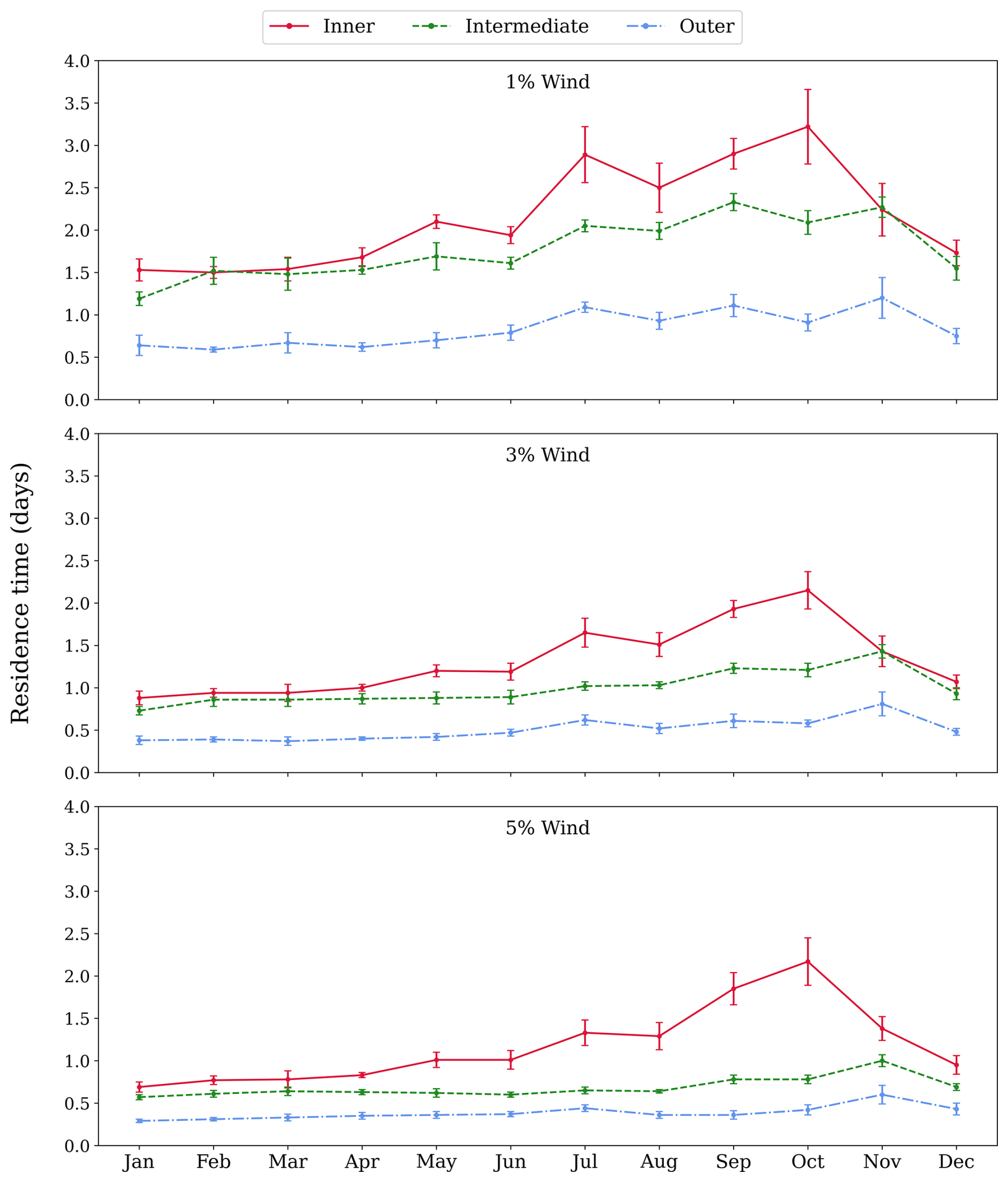 Figure 7Monthly residence times as a function of time for 1 %, 3 % and 5 % wind. Inner, intermediate, and outer regions correspond to solid red, dashed green and dot-dashed blue lines, respectively.