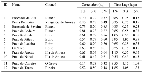Table 1Correlation coefficients and the most frequent time lags (mode, in days) between river discharge and particle beaching for three windage scenarios (cw = 1 %, 3 %, 5 %), for the ten most polluted coastal segments in the study area. ID numbers correspond to locations shown in Fig. 1. For comparison two beaches located in the outer region (ID = 12) and the exterior zone (ID = 11) of the Ría were included.