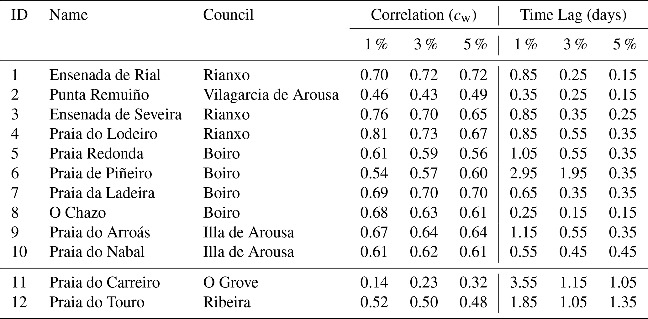 The time lag distribution of beached particles for two wind factors is displayed in Fig. 6. As anticipated for Lagrangian particles carried by wind and surface currents, the data fit a Weibull distribution quite well. As the wind coefficient decreases, the distribution gets wider. The correlation coefficient and the most common time lag between river discharge and particle beaching for three windage coefficients are displayed in Table 1. Because of the river plume effect, beaches O Chazo (ID = 8) and Nabal (ID = 10) have shorter time delays than beaches nearer the river mouth. As previously mentioned, northern beaches are more polluted during the winter and fall rainy seasons, which intensifies the river plume. The significance of geography and coastal currents is demonstrated by the fact that other beaches around those two have the biggest temporal lags. Conversely, as anticipated, time delays along the coast decrease by increased windage. Time lags for two beaches in the outside region are also displayed for comparison. Following up on our earlier statement, we should observe that while Touro Beach is situated on the northern coast and is directly affected by the river plume, its time lag (ID = 12) is lower than Carreiro Beach's (ID = 11). It is also of crucial importance to remind that the number of emitted particles is directly correlated with the riverine discharge.