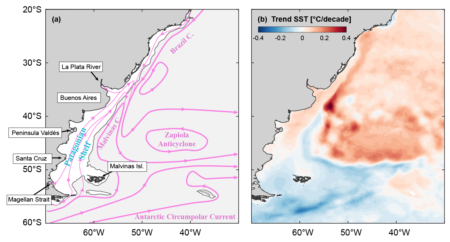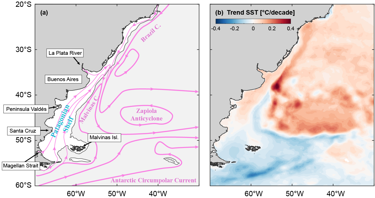 Figure 1(a) General circulation patterns and oceanographic characteristics of the Southwestern Atlantic Ocean (SWA). The grey line, corresponding to the 200 m isobath, delimits the Patagonian Shelf (PS). (b) SST trend (°C per decade) in the region for the period 1980 to 2021.