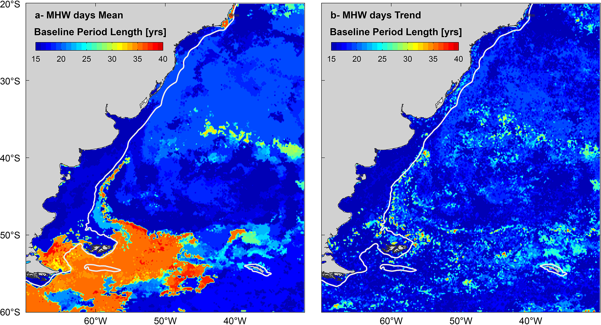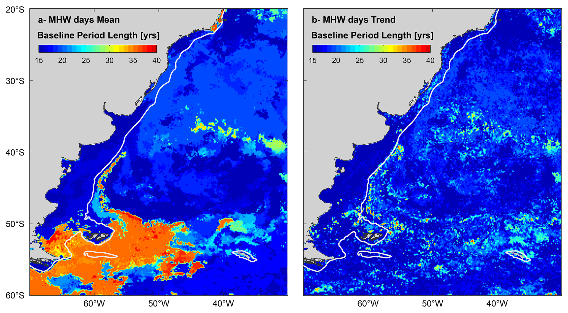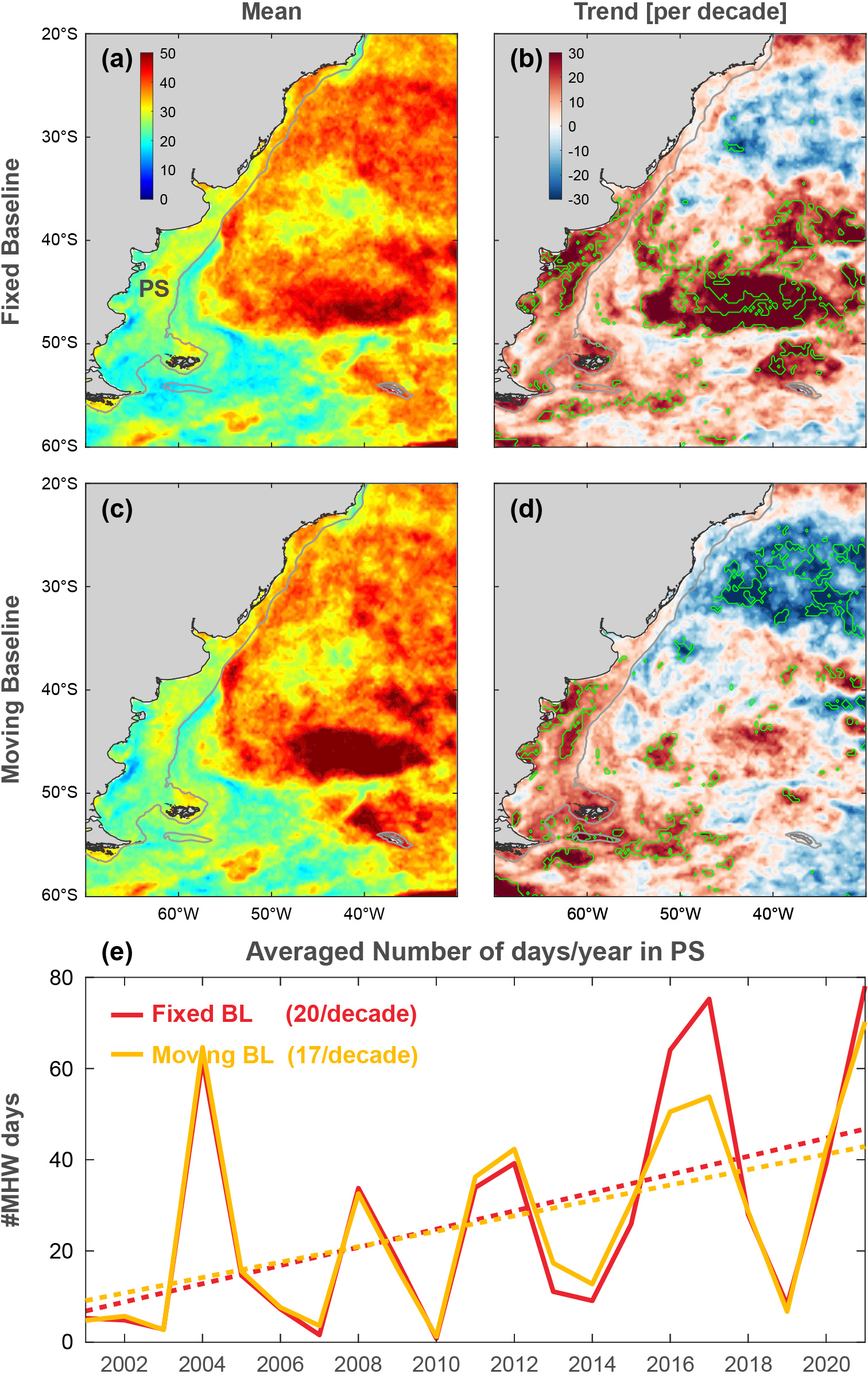 Nearby the PS in the SWA, particularly in the Zapiola Anticyclone, using the fixed baseline method, the trend in MHWs days shows values 3-fold higher than with the moving baseline method for the period 2001–2021, with 33 and 11 MHWs yr−1 per decade, respectively (Fig. 2e). Similarly, the weak negative MHW days trend east of the Brazil Current using a fixed baseline becomes statistically significant using a moving baseline strategy. Over the Patagonian shelf, differences between both methods are weaker (Fig. 2), and the impact on the long-term trends is mostly negligible.