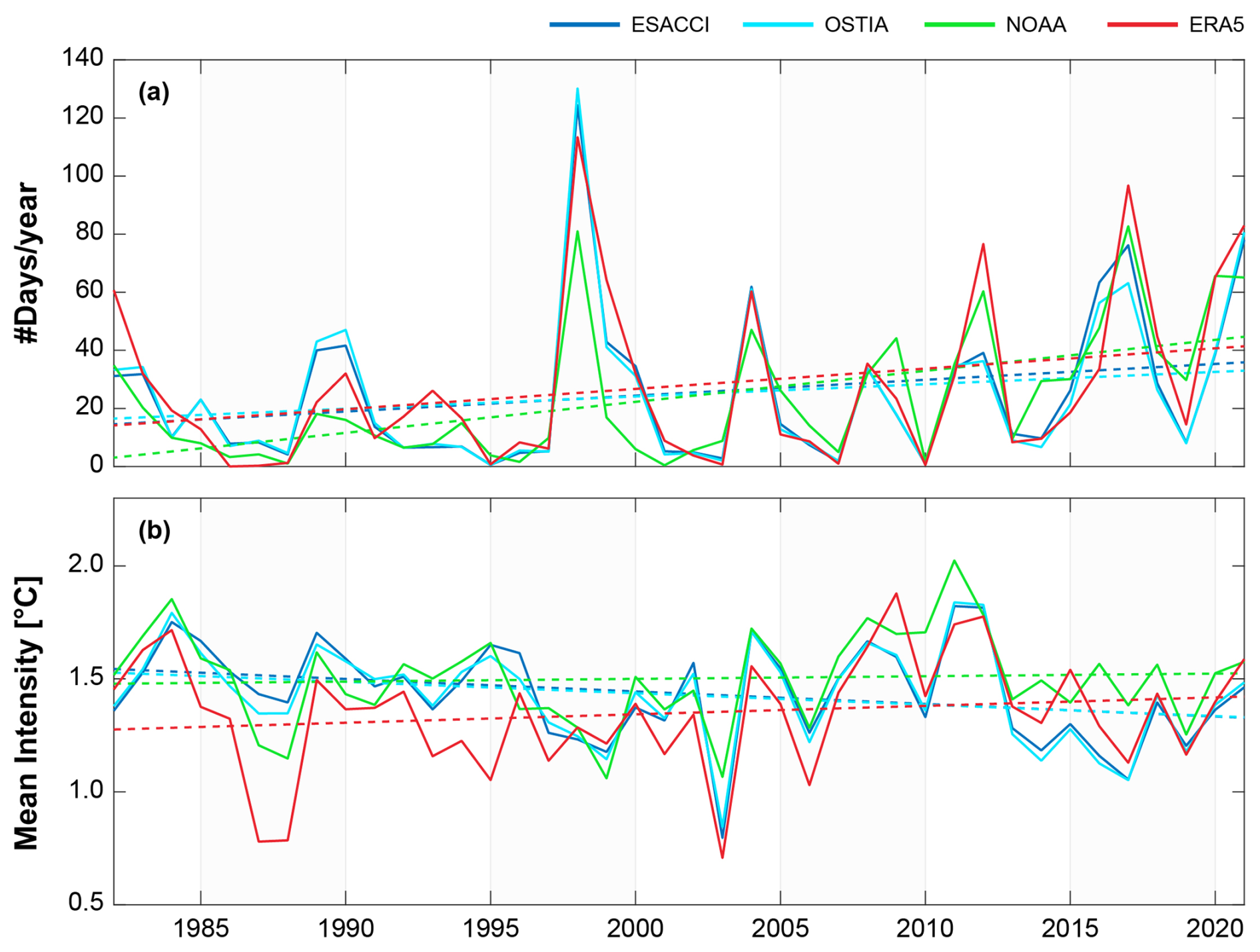 Figure 3Dataset comparison for MHWs assessment in the PS. (a) Interannual variability in the number of MHWs days per year. (b) Mean annual MHW intensity. Dotted lines represent the linear fits to each corresponding dataset (see Table B2 for statistics).