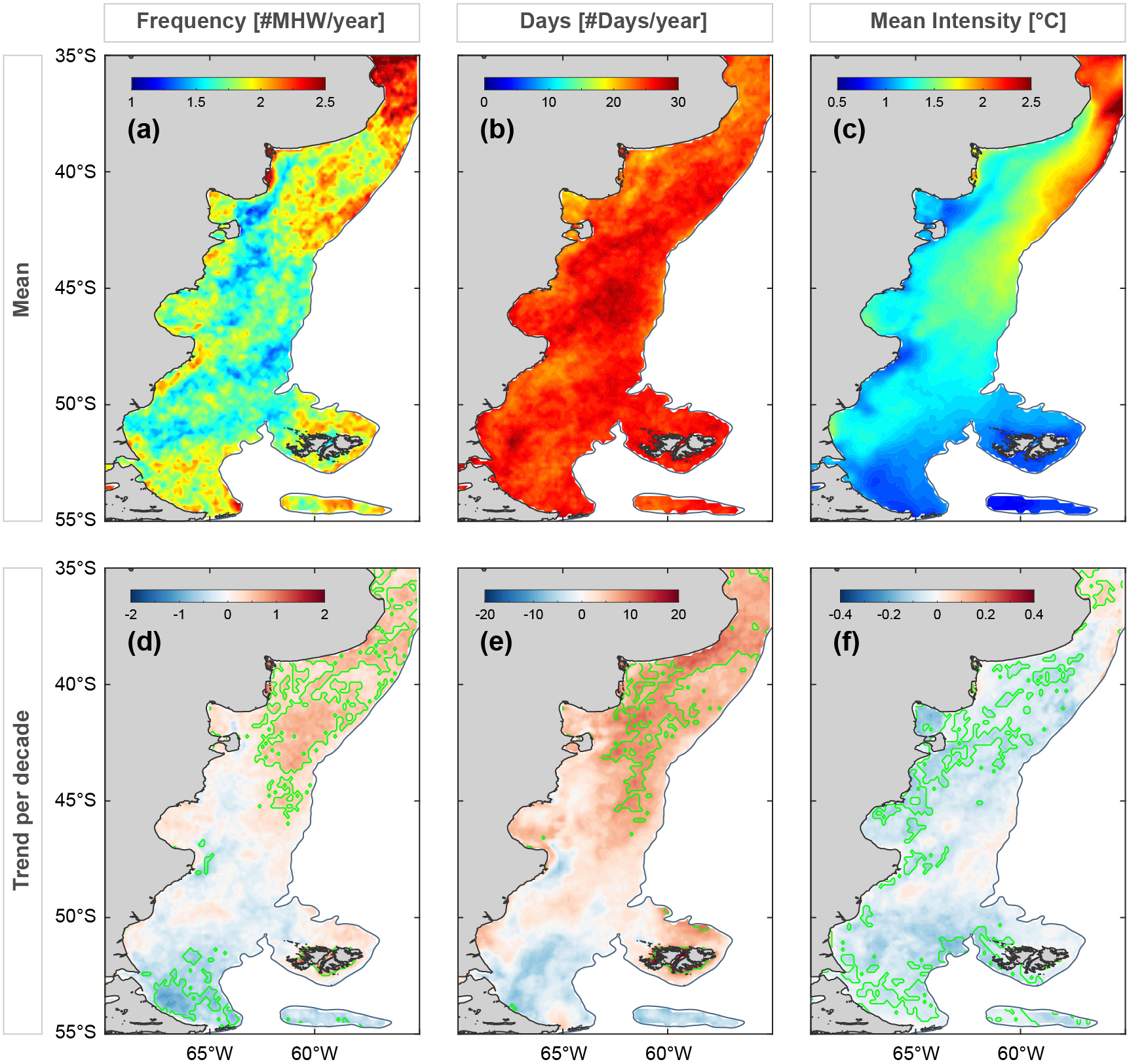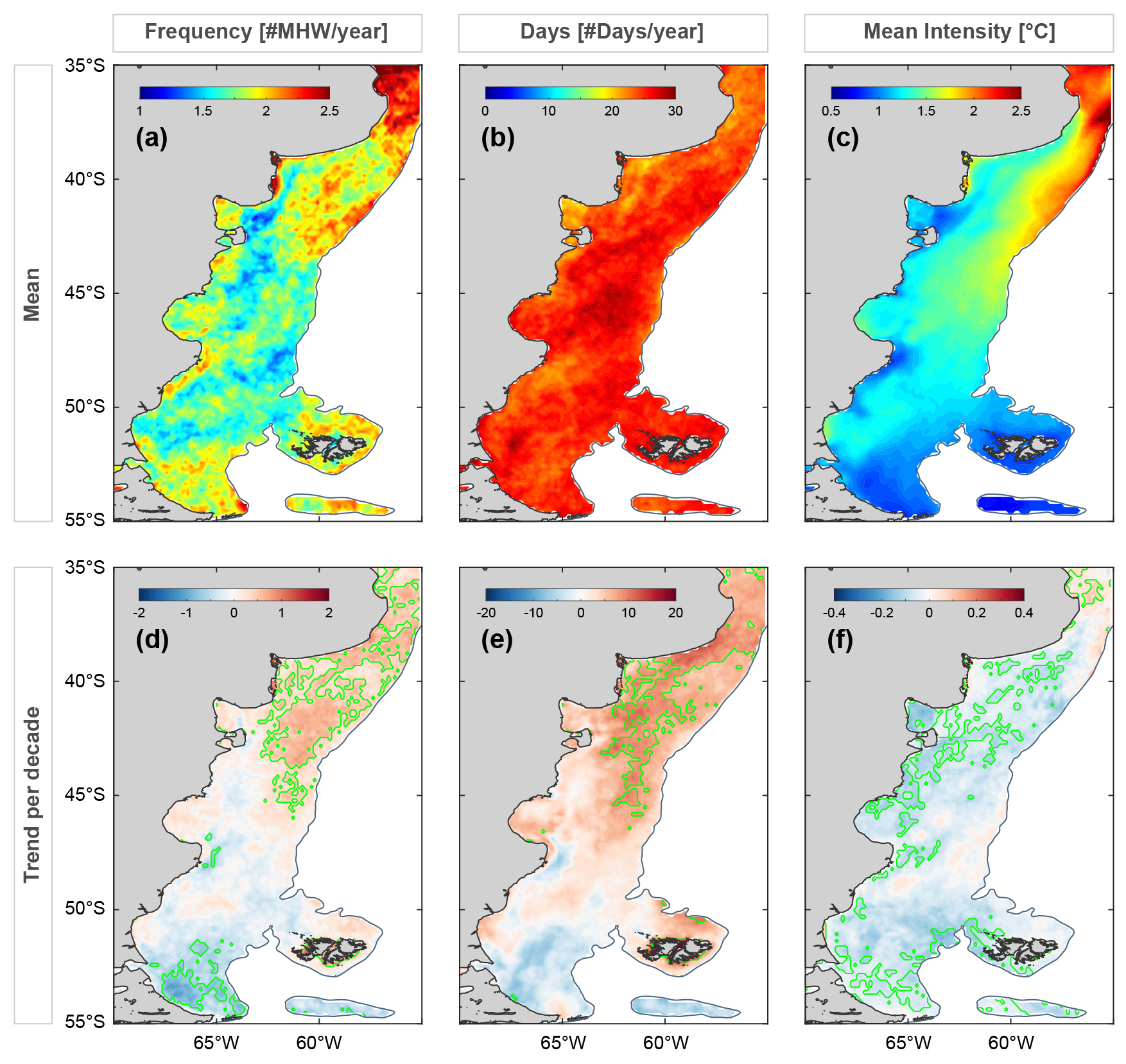 Figure 4(a) Mean frequency, (b) number of cumulative days, and (c) intensity of MHWs in the PS. Corresponding trends are shown in (d), (e), and (f) (values per decade). Areas in green indicate statistically significant trends (p<0.05).