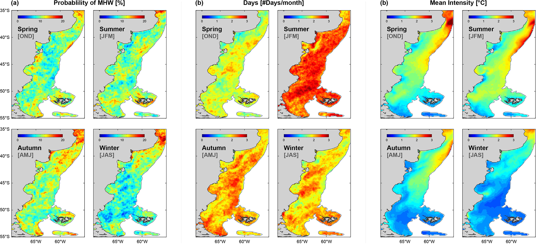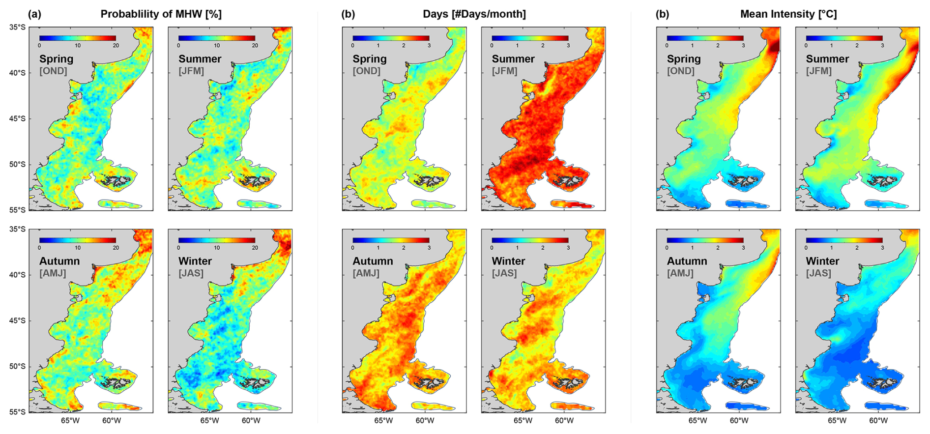 Figure 5Seasonal patterns of MHW. (a) Mean Probability of MHWs occurrence (%). (b) Average number of MHW days per month for each season. (c) Average MHW intensity (°C) by season.