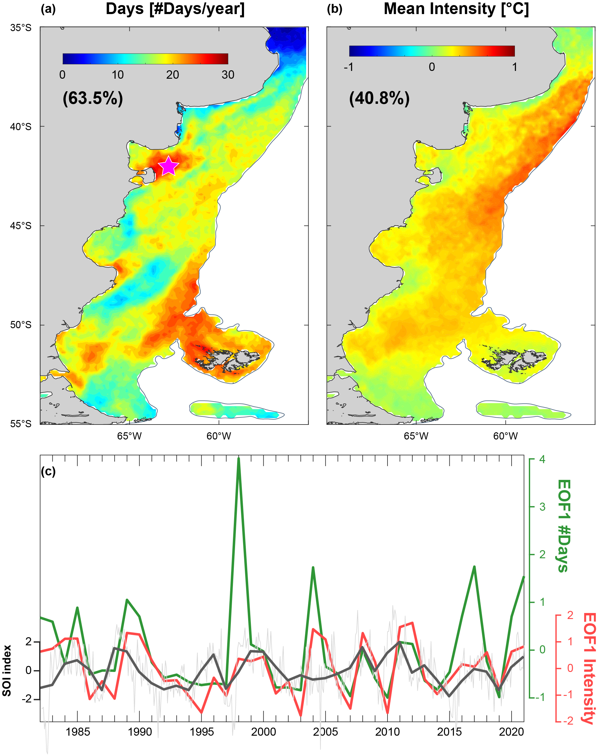The leading empirical orthogonal function mode (EOF1) of the annual number of MHW days per year and mean MHW intensity accounts for 63.5 % and 40.8 % of the total variance, respectively (Fig. 6a and b). Both temporal modes exhibit pronounced interannual variability and are significantly correlated (r=0.57; p<0.05). Despite their temporal correlation, their corresponding spatial patterns differ in the location of maximum variability. For example, the northern sector of the shelf break displays greater variability in MHW intensity than in cumulative duration of the events (number of days), with temperature anomalies reaching up to 1.5 °C above the mean MHWs intensity during extreme events. In contrast, several shelf regions, including the inner and mid-shelf areas off Peninsula Valdés, the vicinity of the Malvinas Islands, and the southern Santa Cruz mid-shelf, accumulate MHW days. At these locations, extreme events have eventually lasted 30 to 110 d longer than average conditions during peak years.