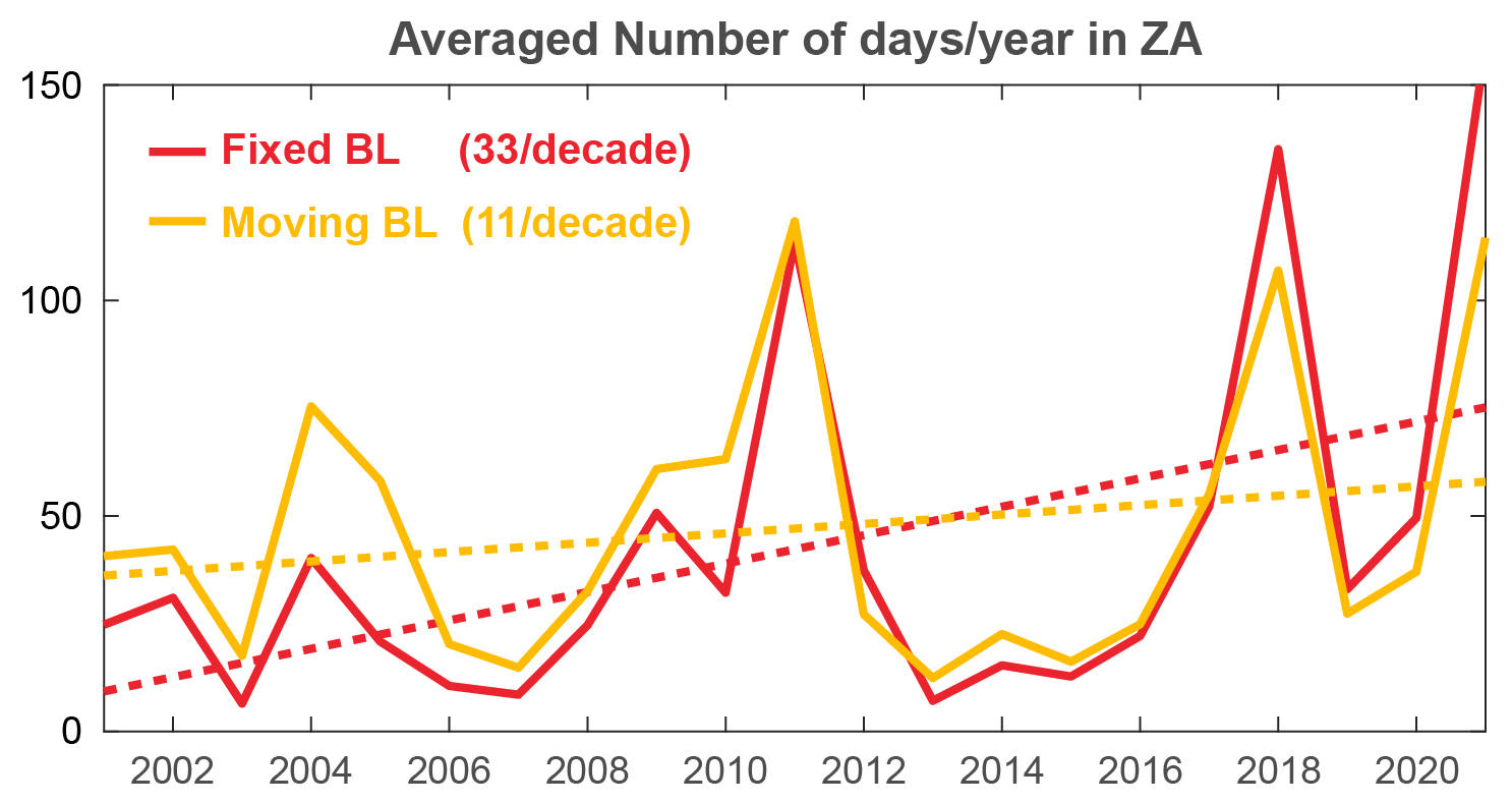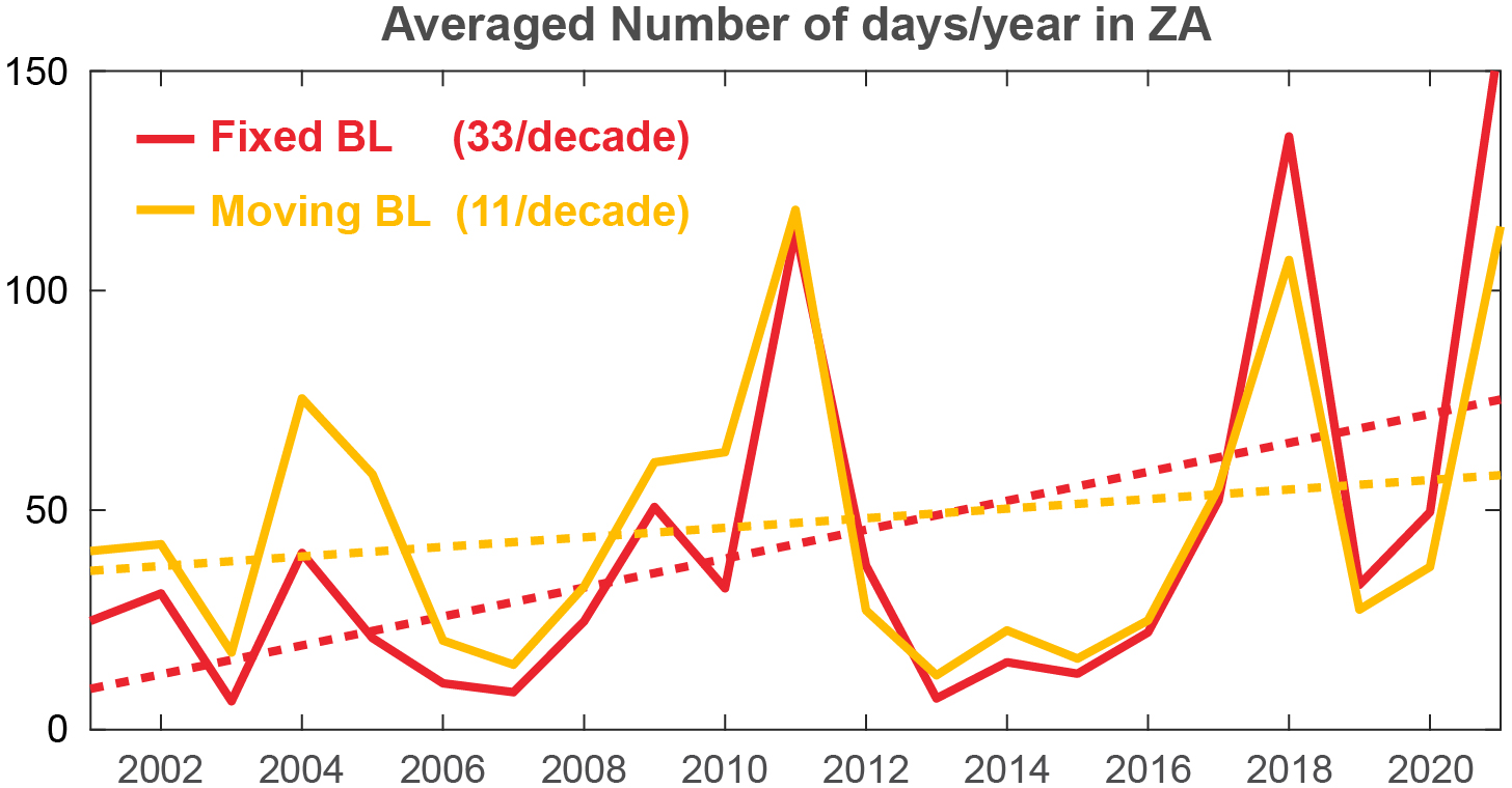 Figure B1Comparison of both methodologies on the interannual variability of the mean number of days in the ZA.