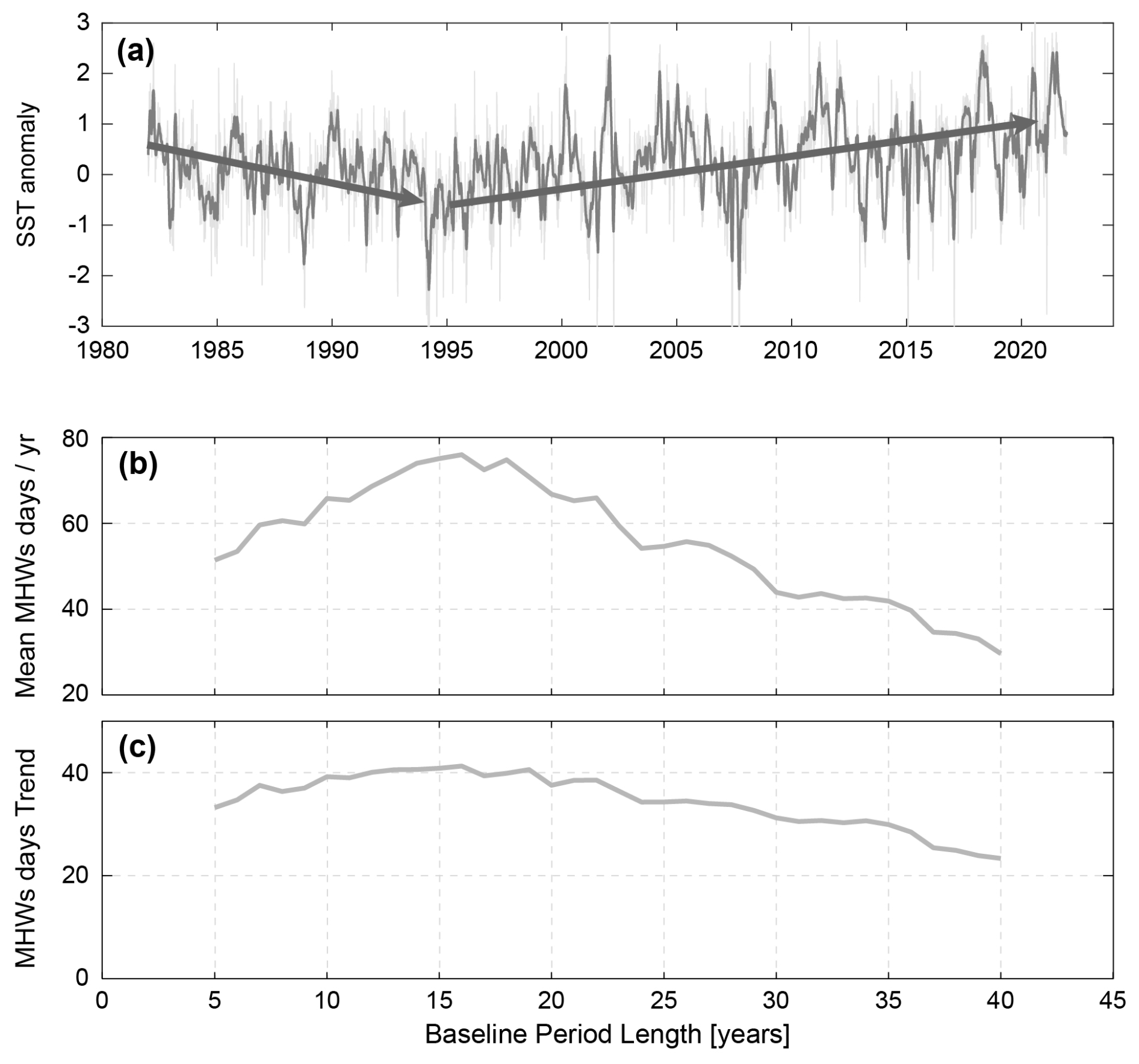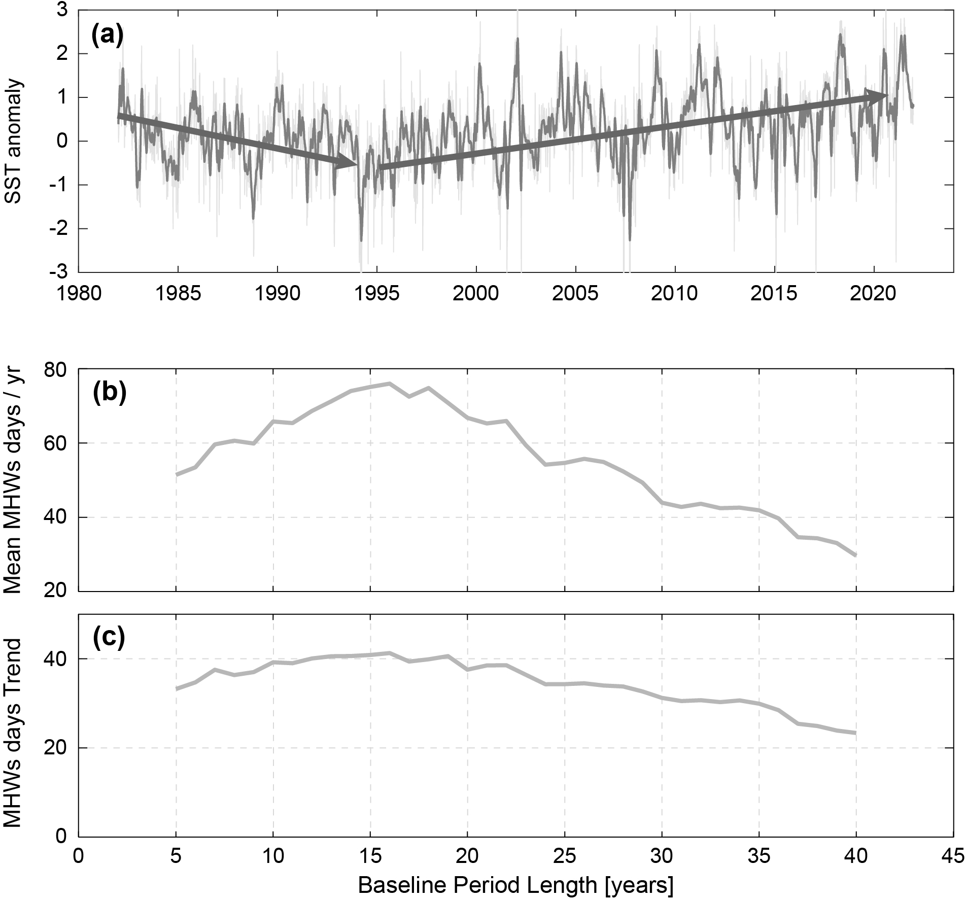 Figure B2(a) SST anomaly (°C) in the Zapiola anticyclone. (b) Number of MHW days per year (averaged over 1982–2021) for different baseline period lengths (in years) ranging from 5 to 40 years (starting in 1982). (c) same as (b) for the trend in MHWs days [#days per year per decade].