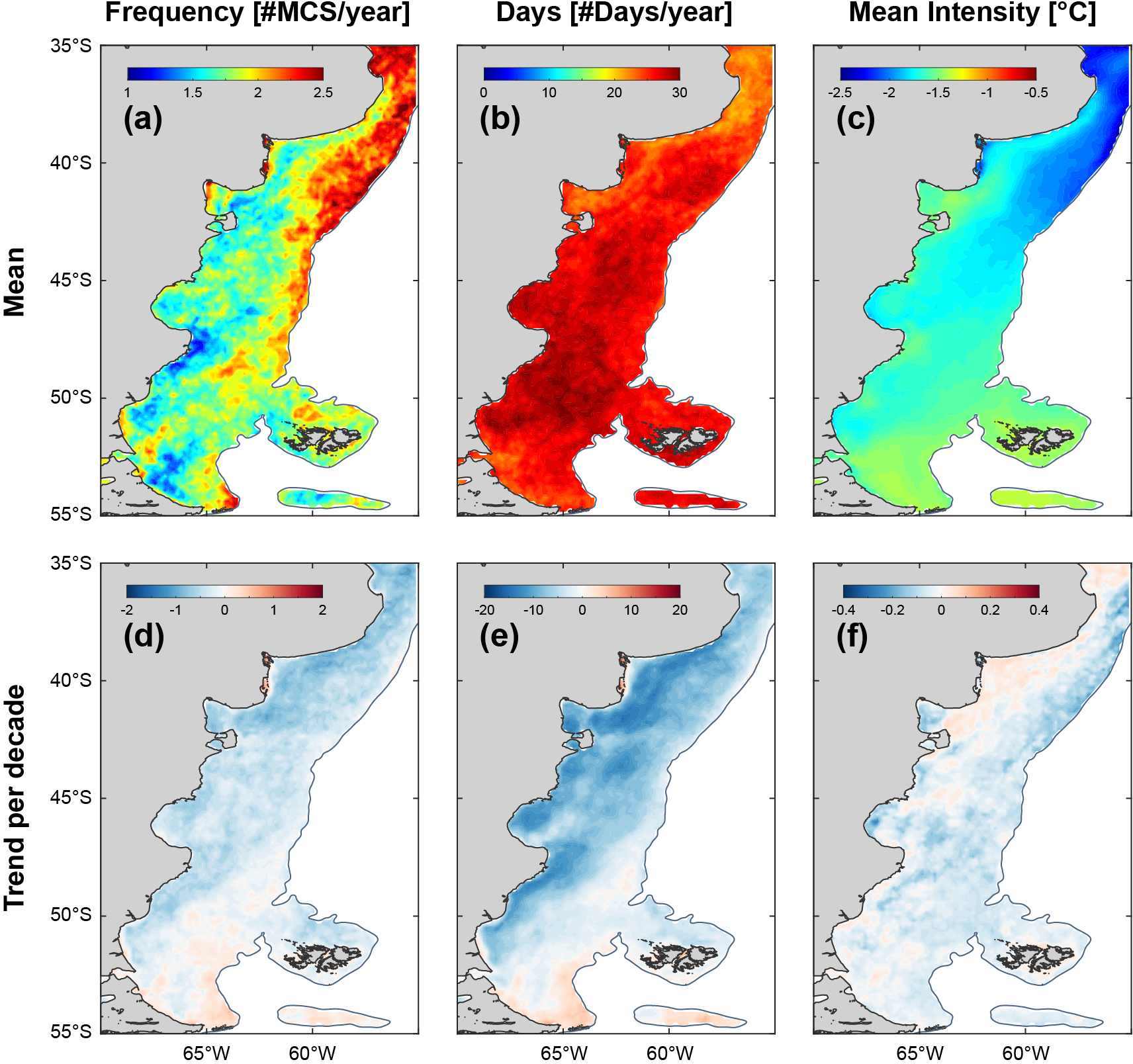As shown in Fig. 4d and e, the frequency of MHWs and the cumulative number of MHW days exhibit significant positive trends north of approximately 42–44° S, indicating an intensification of MHW activity in the northern region. MHW frequency increases at a rate of 0.5 to 1.5 events per decade, while the cumulative number of MHW days rises by 10–20 d per decade (Fig. 4d and e). In contrast, no significant trends are detected south of these latitudes, except for a few isolated locations near Tierra del Fuego, where significant cooling trends emerge (−0.2 °C per decade, Fig. 4f). This spatial pattern is broadly consistent with the SST warming trend shown in Fig. 1b which indicates that the long-term increase in MHW frequency is likely driven, at least in part, by the background warming of the ocean. Notably, the reduction in MHW activity at the southern tip of the Argentine Shelf coincides an increase in the frequency and # of days duration of Marine Cold Spells (MCSs; Schlegel et al., 2021), which are intensifying at rates of 0.5 to 1 event yr−1 per decade and 5 to 10 d yr−1 per decade, respectively (Fig. C1). Overall, MHW intensity across the PS shows a slight decline of approximately −0.2 °C.