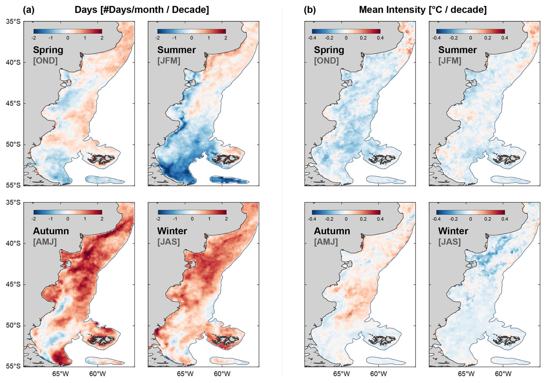 Air–sea heat fluxes play a pivotal role in modulating cumulative MHW intensity during the warm season (Wang and Zhou, 2024). Consistent with this, the highest MHW intensities (>2.5 °C) occur during austral spring and summer, particularly along the northern shelf break and near the Río de la Plata (Fig. 5b). In contrast, during autumn and winter, MHWs seldom exceed 1.5 °C, especially within the mid-shelf region. In addition, MHW intensities exhibit a pronounced seasonal latitudinal migration: events exceeding 2 °C extend northward from the Malvinas region during spring and summer, while shifting toward lower latitudes (∼38° S) in winter. The highest intensities are observed along the shelf break and in open waters, suggesting that enhanced vertical mixing, driven by wind or tides, and the northward coastal flow of the Magellan plume may modulate MHW intensities in shallower shelf areas. Temporal trends in MHWs reveal marked seasonal variability, with the most substantial long-term changes occurring in event # of days rather than intensity (Fig. D1). Across much of the PS, the number of MHW days shows stronger positive trends during autumn and winter, reaching increases of up to ∼2 additional days per month per decade. These seasonal extensions are particularly relevant for assessing some ecological impacts, such as the effect of MHWs on secondary phytoplankton blooms, which typically occur in late autumn and have been reported to increase in frequency in recent years (Delgado et al., 2023).