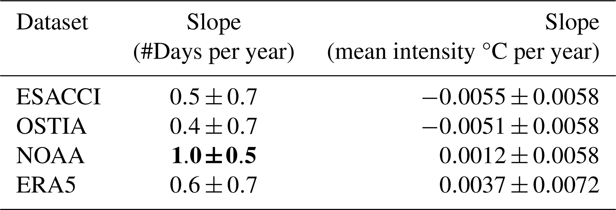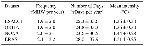 Table B2Marine Heat Waves dataset trends statistics for the Patagonian Shelf. In bold, statistically significant (95 % confidence).