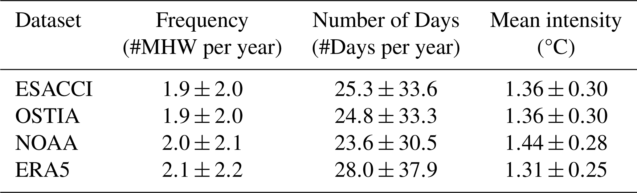 Table B1Marine Heat Waves Statistics. Mean and standard deviation (from yearly time series) values are computed for the Patagonian Shelf.