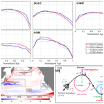 By definition, vorticity measures the local rotation rate of a fluid element. Given that rotation occurs about a specific axis, vorticity is therefore naturally represented as a vector. Theoretically, vorticity reaches its maximum at the eddy center and exhibits a radial decay, diminishing to zero at the eddy boundary. Therefore, the maximum vorticity value is adopted to represent the eddy's relative vorticity in subsequent analyses (Batchelor, 2000). The strain rate, in contrast, measures the eddy's capacity to deform and mix ambient fluid. It is a key parameter for understanding eddy-driven material transport, energy transfer, and the generation of secondary processes. In the SCS region, the normalized vorticity under GEO balance increases rapidly during eddy generation, significantly exceeding the CGEO values (Fig. 14a). For strain rate (Fig. 14b), CGEO maintains a higher overall magnitude than GEO, but exhibits a much lower rate of increase during the decay stage. In the CC region (Fig. 14c and d), the variation trends of GEO and CGEO are generally similar. Throughout the generation phase, the vorticity increase in GEO is relatively small. However, the normalized vorticity of GEO-AE rises more markedly than that of CGEO-AE, whereas the normalized vorticity of CGEO-CE begins to decay directly. Notably, CGEO-CE shows a slight increase during the dissipation phase. GEO and CGEO show comparable declining trends in strain rate, but the dissipative increase is markedly smaller for CGEO. The KE region (Fig. 14e and f) shows that CGEO vorticity decays slowly, yet remains higher than GEO during both the initial generation and final dissipation phases (Penven et al., 2014). The strain rate variations of GEO form a shallow concave shape, while those of CGEO remain stable initially before rising during dissipation. By comparison, the decline of CGEO is sharper and its recovery slower. As seen in the AI region (Fig. 14g and h), overall vorticity curves display more pronounced fluctuations. During generation, cyclonic eddy (CE) vorticity in both frameworks increases at comparable rates. For anticyclonic eddies (AE), GEO-AE shows a mild increase while CGEO-AE experiences a slight decrease, though GEO-AE retains a higher initial value. By the maturation phase, CGEO-AE undergoes noticeable growth that continues into dissipation, eventually resulting in a higher dissipation value than GEO-AE. Anticyclonic eddies also exhibit greater variability in strain rate compared to cyclonic eddies. Notably, CGEO strain rate falls faster but recovers more slowly than GEO. In the HI region (Fig. 14i and j), the vorticity increase of CGEO during generation is smaller than that of GEO, and its decay rate during dissipation is also lower. Although CGEO vorticity exceeds GEO at both initial and final stages, its peak value during maturation is lower (Shakespeare, 2016; Ioannou et al., 2019). The strain rate shows an approximately concave decline. The rates of decrease and increase during generation and dissipation are higher for GEO than for CGEO. Specifically, the strain rate of GEO-AE experiences an upward trend followed by a decline during the eddy maturation phase. As shown in the Fig. 14, vorticityand strain rate exhibit an inverse relationship for most of the time shown. In fluid dynamics, vorticity (describing local rotation) and strain rate (describing local stretching/shearing) collectively form the velocity gradient tensor, providing a complete kinematic description of a fluid parcel's motion (Kim, 2010). From an energy perspective, they jointly partition the kinetic energy of turbulence or disturbances. Under certain conditions, an increase in one quantity may occur at the expense of the other.
