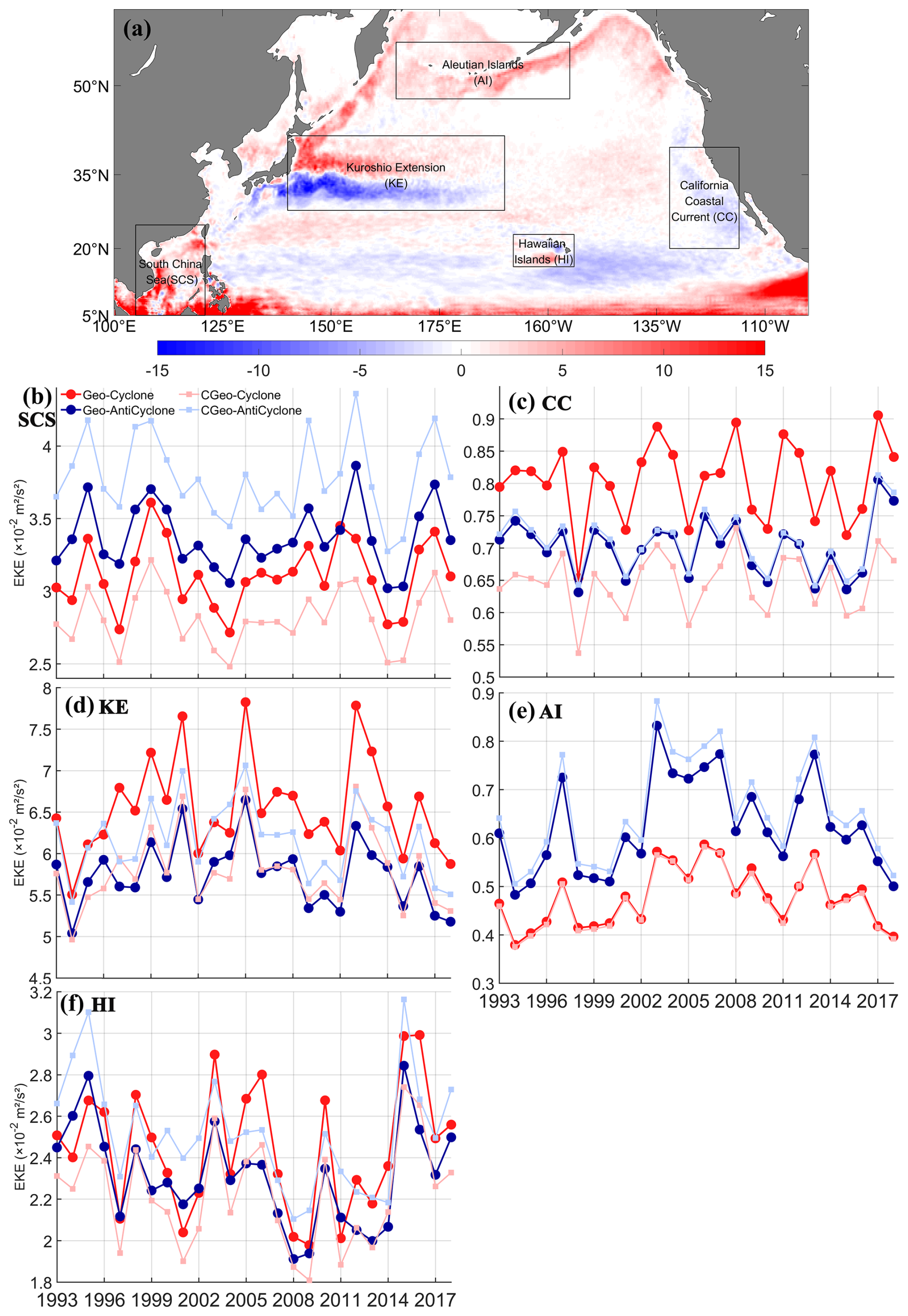 Figure 1(a) Spatial distribution of normalized difference between multi-year average geostrophic EKE and cyclogeostrophic EKE over the period of January 1993–December 2018 in the North Pacific. Time series of interannual variation of area averaged EKE in the (b) South China Sea (SCS), (c) California Coastal Current (CC), (d) Kuroshio Extension (KE), (e) Aleutian Islands (AI), (f) Hawaii Islands (HI), the dotted solid blue and red lines represent geostrophic cyclonic and anticyclonic currents, respectively. The dotted solid light blue and red lines represent the cyclogeostrophic cyclonic and anticyclonic currents, respectively.