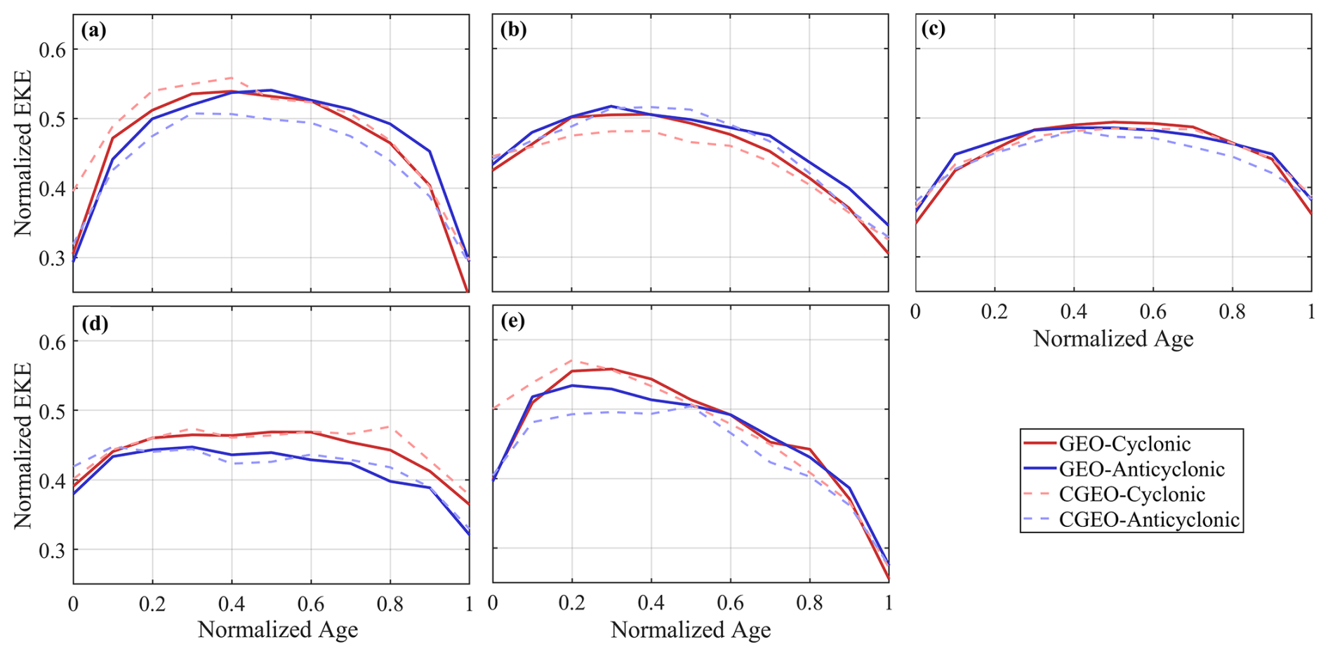 Figure 2Temporal evolution of normalized eddy kinetic energy in (a) SCS, (b) CC, (c) KE, (d) AI, and (e) HI. Analysis restricted to eddies persisting>28 d. Solid red line represents geostrophic cyclonic eddies and dashed red line represents cyclogeostrophic cyclonic eddies. The solid and dashed blue lines indicate geostrophic and cyclogeostrophic anticyclonic eddies, respectively. Each life stage is defined by normalized age: generation (), intensification (), maturation (), and decay (>0.8).