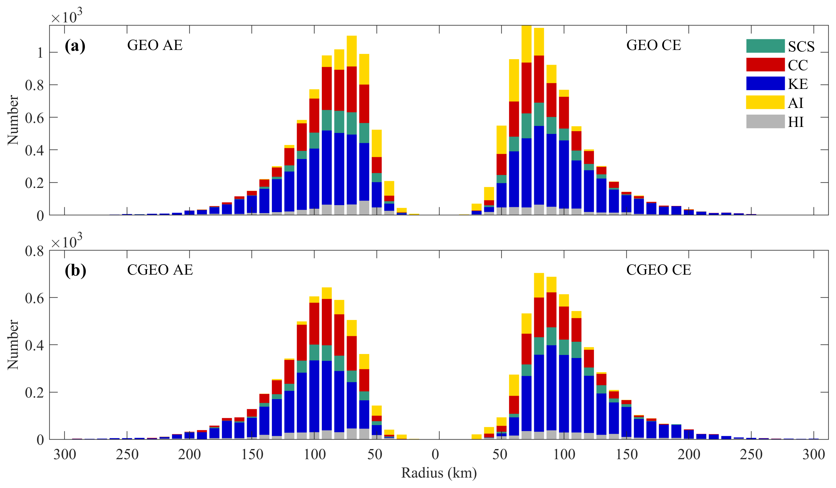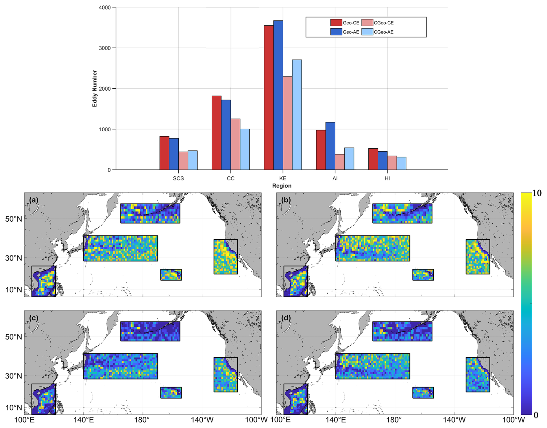 As shown in Fig. 11, in the KE region, cyclonic eddies (CEs) (Fig. 11b and d) are predominantly distributed south of the Kuroshio Extension axis, while anticyclonic eddies (AEs) (Fig. 11a and c) are concentrated to the north. In the CC region, eddy dissipation occurs mainly in the coastal areas, whereas in the HI region, it is distributed along the western coast of the Hawaiian Islands. In the AI region, the dissipation of GEO eddies is largely concentrated in the eastern and southwestern sectors, while that of CGEO eddies is focused primarily in the east. In the SCS region, the number of CGEO eddies generated in the southern part is notably lower than the number of GEO eddies in other areas of the basin.