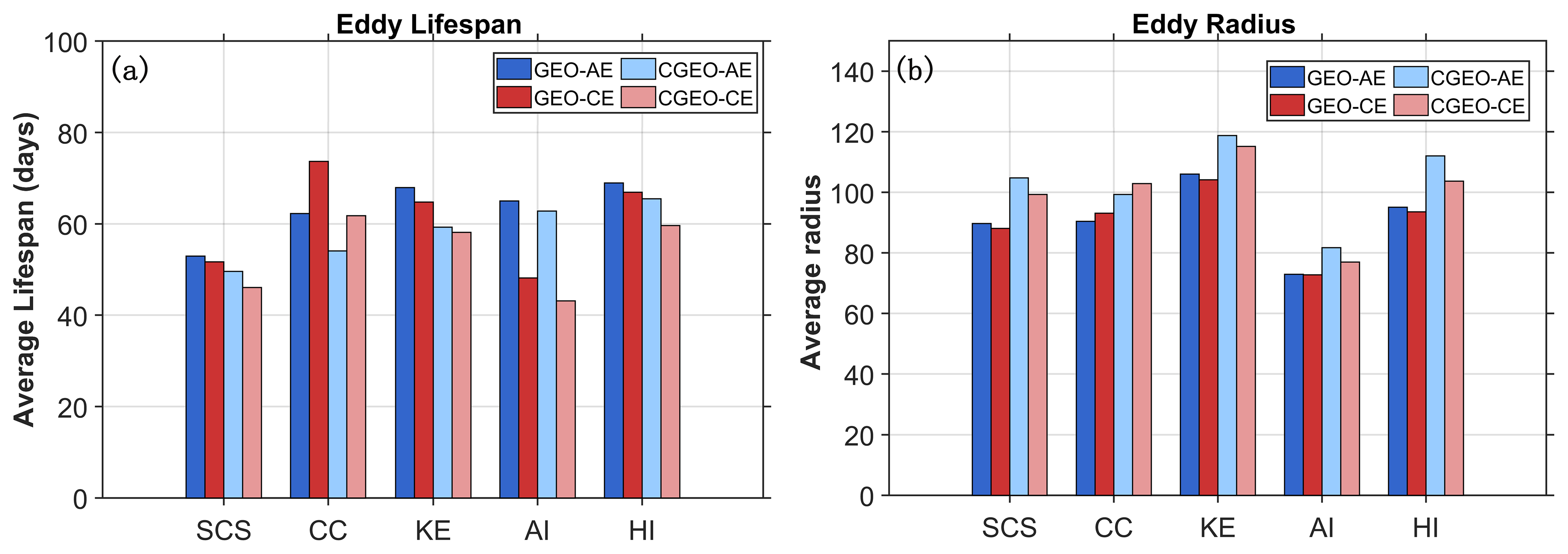 An analysis and comparison of the number, radius, and lifespan of eddies (with lifespans exceeding 4 weeks) were carried out across five study regions in the North Pacific between 1993 and 2018. The Lagrangian method was applied to quantify eddy counts by treating each complete eddy lifecycle as a single unit. In terms of eddy numbers (Fig. 3a), the total under cyclogeostrophic balance is generally lower than that under geostrophic balance. Specifically, the geostrophic balance yields approximately 35.65 % more eddies than the cyclogeostrophic balance, which is far larger than the eddy count difference of about 8 % induced by different eddy detection algorithms (You et al., 2022). In the AI and KE regions, anticyclonic eddies predominate over cyclonic eddies, while in the CC and HI regions, cyclonic eddies are more prevalent than anticyclonic eddies. To gain a clearer understanding of the distribution of eddies in different regions, a 1°×1° grid was used to delineate the statistical areas. The counted eddies were confined to those with their entire lifecycle within the study area. Based on the center position of each eddy at each moment, all eddies within each grid point were counted. Compared to the geostrophic conditions (Fig. 3b and c), fewer eddies were detected under cyclogeostrophic conditions (Fig. 3d and e). Despite this difference, both frameworks show strong spatial correspondence across all regions. In the AI region, eddy occurrence is relatively sparse near the central coastal margin, whereas higher concentrations are observed in the northwestern and southeastern areas. The KE region exhibits a substantial number of eddies under both geostrophic and cyclogeostrophic conditions, with cyclonic eddies dominating the southern and eastern zones, and anticyclonic eddies more frequent in the northern and southwestern sectors. West of the Hawaiian Island, a localized area shows a notable density of eddies in both GEO and CGEO datasets. The CC is one of the most productive eastern boundary upwelling systems and exhibits frequent mesoscale activity. However, due to the predominance of cyclonic circulation in this region, the number of cyclogeostrophic eddies is relatively lower than that of geostrophic eddies.