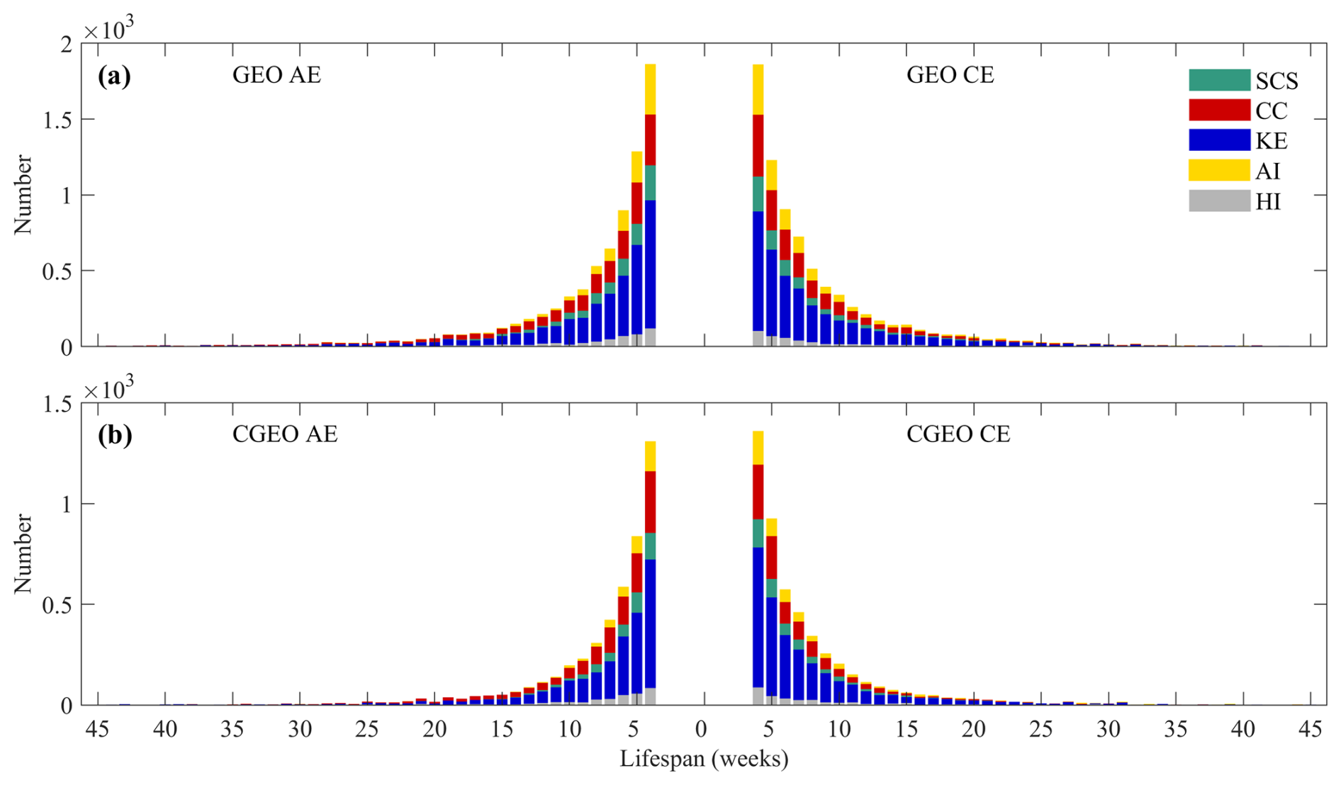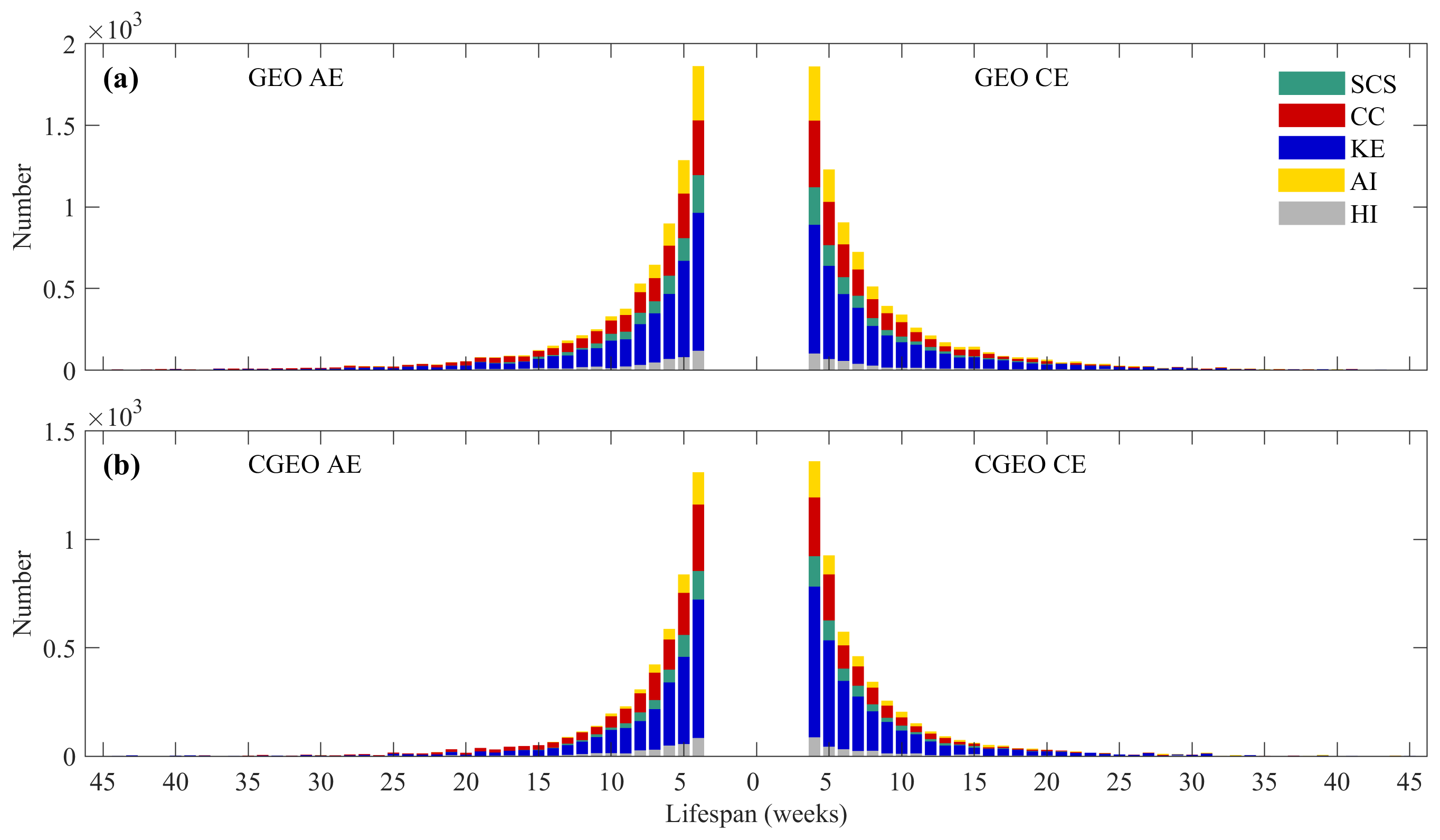 Statistical analysis of eddy lifespans (Fig. 6) reveals that short-lived eddies are more numerous than long-lived eddies in both datasets. As lifespans increase, the numbers of both anticyclonic eddies (AEs) and cyclonic eddies (CEs) decrease. This occurs because the rotational energy of an eddy gradually lost to the surrounding environment through various processes after its formation. Consequently, eddies with longer lifespans become increasingly difficult to maintain, ultimately leading to their dissipation. Figure 6 shows that eddies in the CGEO dataset generally have shorter lifespans than those in the GEO dataset. In the GEO dataset (Fig. 6a), eddies with lifespans of 4–10 weeks account for 77.5 % of AEs and 77.3 % of CEs. In contrast, the CGEO dataset shows higher proportions in this lifespan range: 82.9 % for AEs and 80.9 % for CEs (Fig. 6b). A notable difference between the two datasets is observed for eddies lasting longer than 20 weeks. Only 5.3 % of AEs and 5.2 % of CEs in the GEO dataset fall into this category, compared to 3.6 % of AEs and 4.2 % of CEs in the CGEO dataset. Among all eddies with lifespans exceeding 10 weeks, the GEO dataset contains 22.2 % AEs and 22.7 % CEs, whereas the CGEO dataset contains 17.1 % AEs and 19.1 % CEs. These results indicate that CEs generally have longer lifespans than AEs.