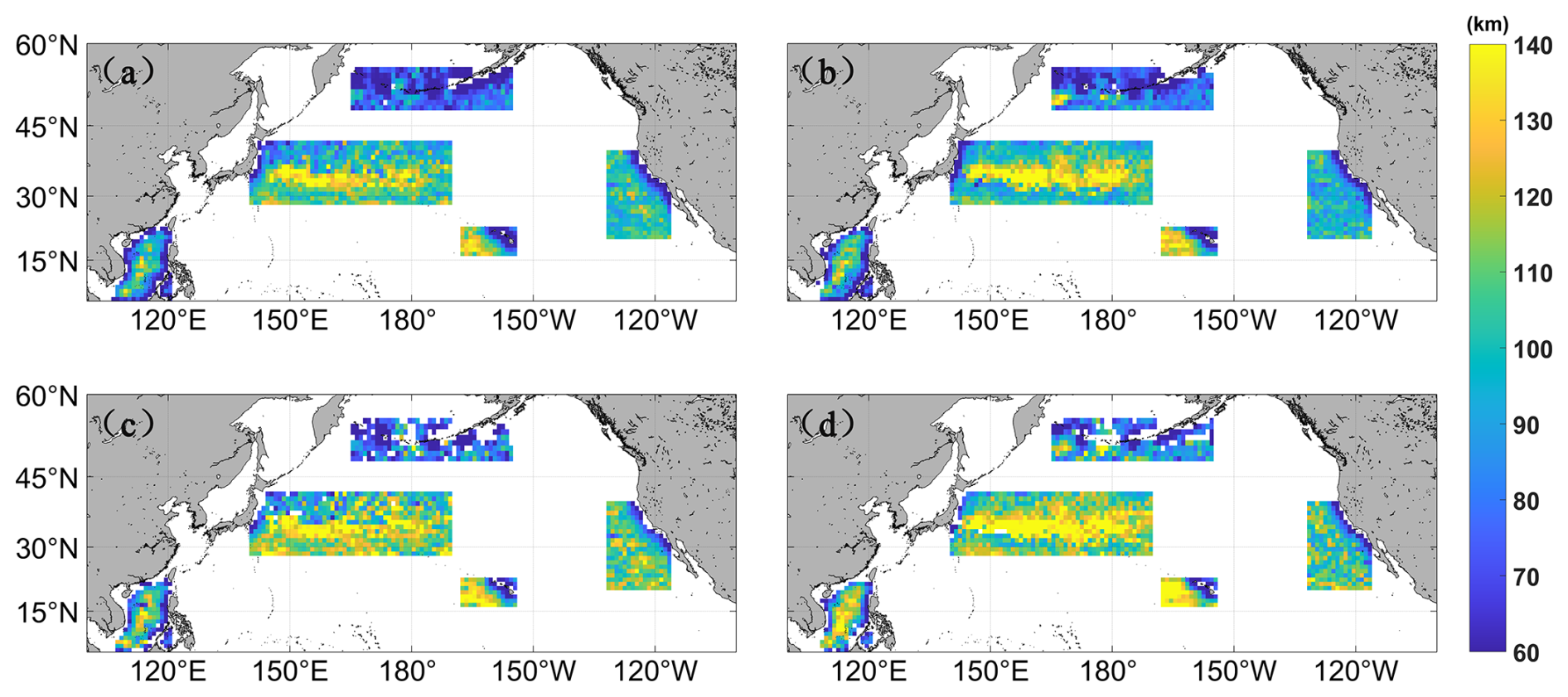 Figure 7Spatial distributions of eddy radius for (a) CEs and (b) AEs identified under geostrophic balance conditions, and for (c) CEs and (d) AEs identified under cyclogeostrophic balance conditions.