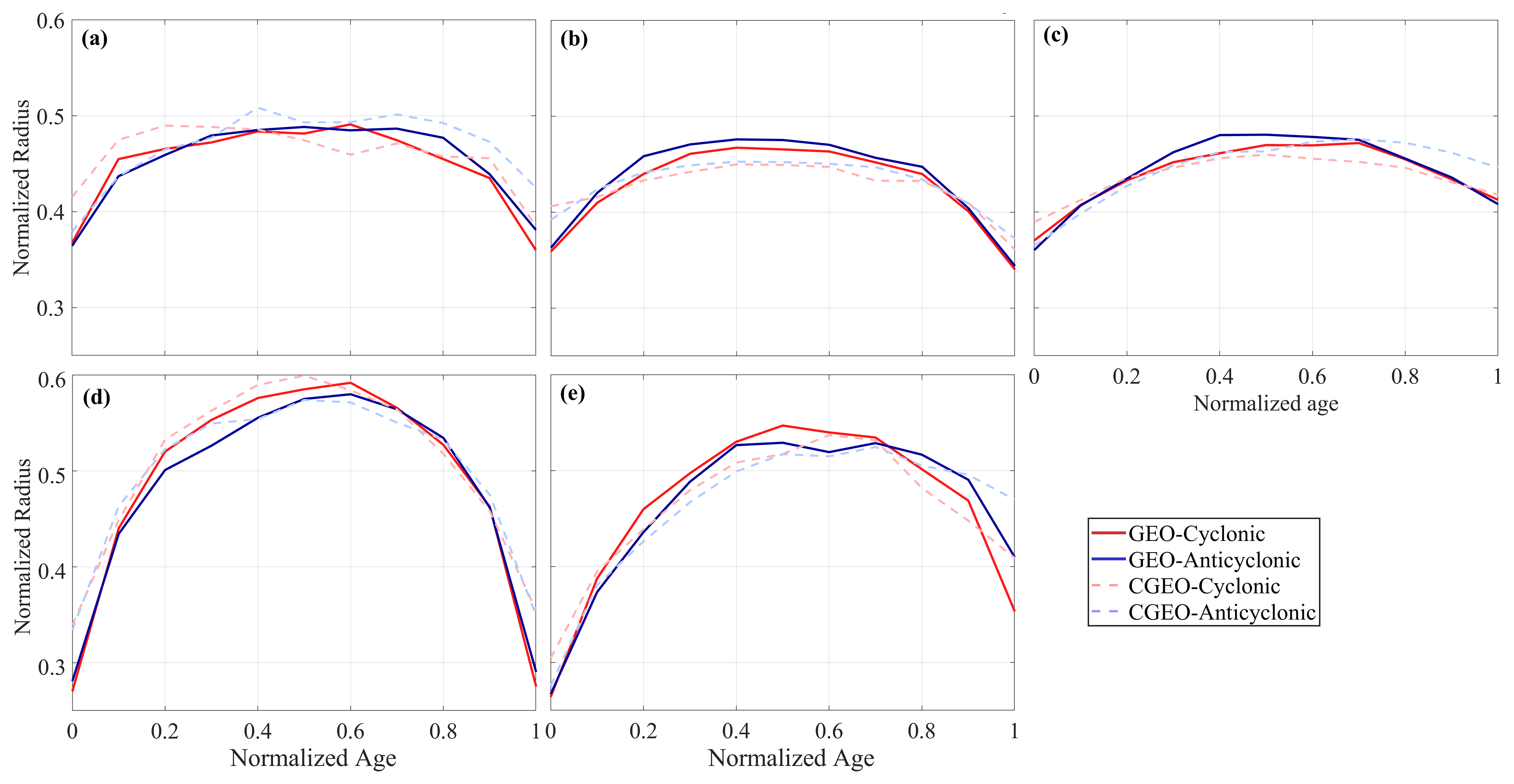 We normalize the surface eddies that have a lifespan longer than 7 d. The X axis is divided by the lifespan of each individual eddy, while the Y axis variables are normalized by dividing each variable by its corresponding maximum value throughout the entire lifespan process.The average normalized eddy radius across the five regions exhibits a similar concave-up trend with the normalized eddy lifespan parameters and eddy kinetic energy (Fig. 8). The eddy radius of both CGEO and GEO shows a rapid increase during the formation phase, a slight growth slowdown during the development phase, stability during the mature phase, and a rapid decline during the dissipation phase.In the AI region (Fig. 8a), the normalized eddy radius curves of anticyclonic eddies are similar between the GEO and CGEO datasets during the eddy formation phase. For cyclonic eddies, however, the normalized radius of CGEO is significantly larger than that of GEO in the early formation stage. After correction of the CGEO data, the growth rate of CGEO eddies during the formation stage is lower than that of GEO eddies; during the mature phase, the normalized radius of CGEO eddies fluctuates more in both amplitude and frequency compared to GEO eddies. In the dissipation phase, the radius decay rate of GEO eddies is faster than that of CGEO eddies.In the KE region (Fig. 8b), the growth rate of CGEO eddies during the generation phase is lower than that of GEO eddies, while the radius decay rate of GEO eddies during the decay phase is higher than that of CGEO eddies. At both the initial generation and final decay stages, the radius of CGEO eddies is greater than that of GEO eddies; however, during the maturation phase, the maximum radius of CGEO eddies is smaller than that of GEO eddies.In the SCS region (Fig. 8c), the growth rate of CGEO eddies during the generation phase and the radius decay rate during the decay phase are both lower than those of GEO eddies. The radius of CGEO eddies is larger than that of GEO eddies at the initial generation and final decay stages. In the maturation phase, the peak radius of GEO-CE is slightly higher than that of CGEO-CE, while the peak radii of GEO-AE and CGEO-AE are similar.In the CC region (Fig. 8d), the growth rate of CGEO eddies during the generation phase and the radius decay rate during the decay phase are both lower than those of GEO eddies. At the initial generation stage, the radius of CGEO-AE is greater than that of GEO-AE, while the radii of CEs under the two balance conditions are similar. At the final decay stage, the radius of CGEO-CE is greater than that of GEO-CE, while the radii of AEs under the two balance conditions are similar. Additionally, during the generation phase, the growth rate of CGEO-CE radius is greater than that of GEO-CE, while the growth rates of CGEO-AE and GEO-AE are similar; the opposite trend is observed during the decay phase.n the HI region (Fig. 8e), the growth rate of CGEO eddies during the generation phase and the decay rate during the decay phase are both lower than those of GEO eddies. When eddies are initially generated, the radius of CGEO-CE is larger than that of GEO-CE, while the radii of AE under the two balance conditions are similar. At the final decay stage, the radius of CGEO eddies remains greater than that of GEO eddies.Overall, across the five regions, the radii of GEO eddies are comparable between the initial generation and final decay phases. For the modified CGEO dataset, the growth of AE during the generation phase is greater than that of CE, while the decay of AE during the decay phase is slower than that of CE. When CGEO eddies are initially generated, the radius of CE is larger than that of AE; however, by the final decay phase, the radius of CE becomes smaller than that of AE.Across the five regions, the growth rate of CGEO eddies during the generation phase is lower than that of GEO eddies, while during the decay phase, the radius decay rate of GEO eddies is faster than that of CGEO eddies. Additionally, AE in the modified CGEO dataset exhibits better radius retention characteristics.