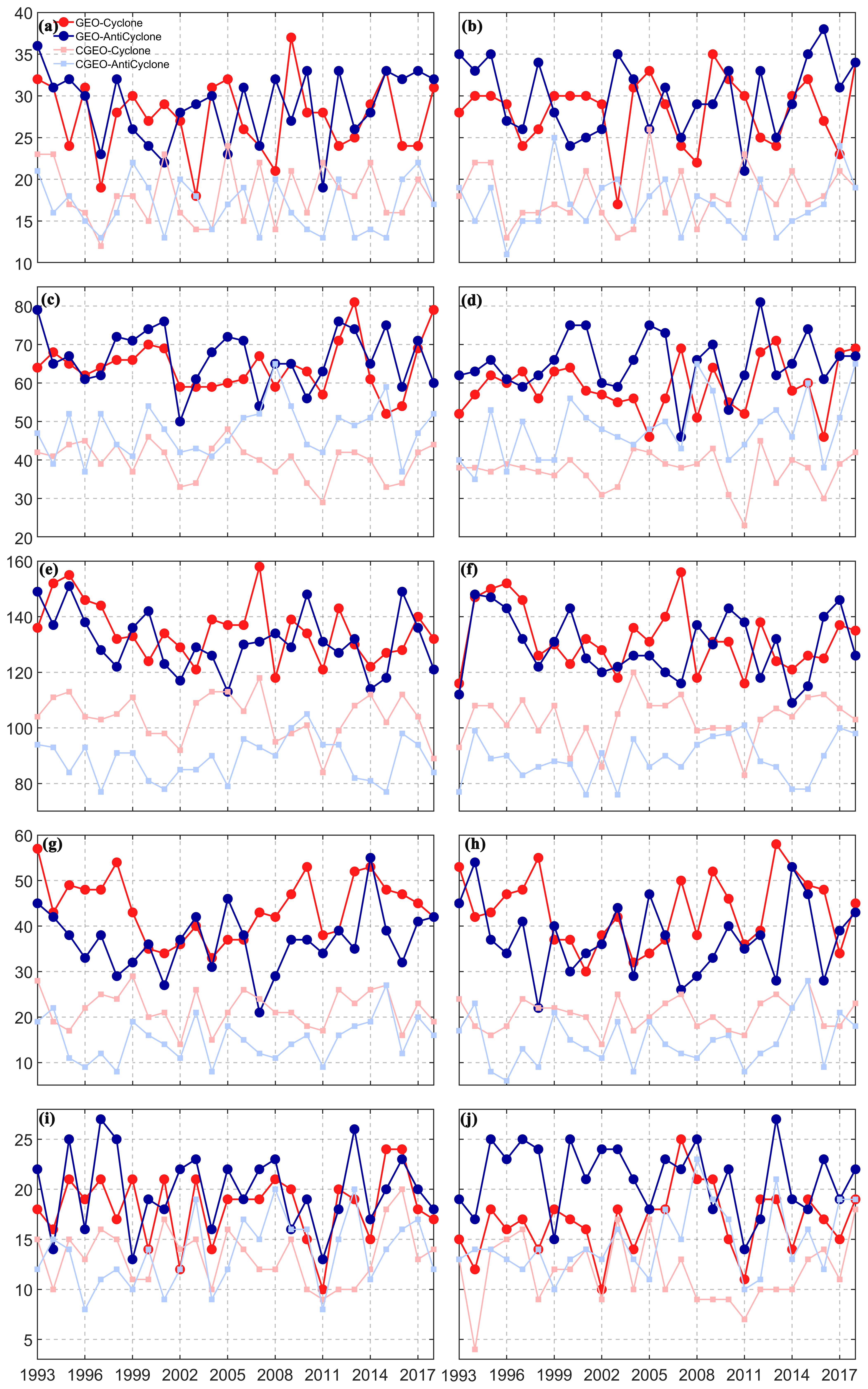 Figure 9Interannual average time series of eddy generation and dissipation numbers (January 1993–December 2018). (a, b) SCS; (c, d) CC; (e, f) KE; (g, h) AI; (i, j) HI. The left column (a, c, e, g, i) shows eddy generation, and the right column (b, d, f, h, j) shows eddy dissipation. The dashed blue and red lines represent GEO-CE and GEO-AE, respectively. The dashed solid light blue and red lines represent CGEO-CE and CGEO-AE, respectively.