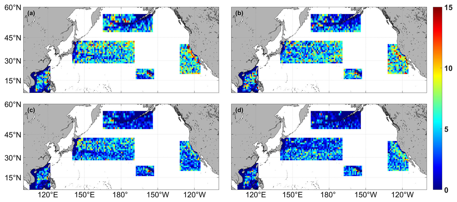 The North Pacific, with its complex circulation structure, is a region of highly active mesoscale eddies. It hosts intricate current systems such as the North Equatorial Current, the Kuroshio, and the North Pacific Current, where interactions between different flow systems generate a large number of mesoscale eddies. Previous studies have identified two zonal bands with high eddy kinetic energy in this region: one is the Kuroshio Extension, and the other is the North Pacific Subtropical Countercurrent region (Kang et al., 2010; Chang and Oey, 2014). In the Kuroshio Extension, eddy activity levels are modulated by the dynamical state of the Kuroshio and influenced by the wind stress curl in the eastern North Pacific. Both the Kuroshio and regional eddy intensity exhibit significant decadal oscillations (Qiu and Chen, 2005, 2013; Taguchi et al., 2010). The northern part of the Kuroshio Extension is dominated by anticyclonic eddies, while the southern part is predominantly cyclonic (Itoh and Yasuda, 2010). The North Pacific Subtropical Countercurrent region features complex circulation due to vertical shear with the North Equatorial Current, leading to intense mesoscale eddies. Previous studies have completed eddy identification (Hwang et al., 2004) and dataset construction (Liu et al., 2012) in this area, confirming that eddies intensify as they propagate westward and influence the Kuroshio. Eddy kinetic energy in this region also exhibits interannual scale characteristics (Qiu and Chen, 2010, 2013; Chow et al., 2017), with baroclinic instability being a key driver of its seasonal variability (Chang and Oey, 2014). Additionally, the spatiotemporal variability of eddies is regulated by baroclinic instability (Travis and Qiu, 2017; Rieck et al., 2018). The Hawaiian Islands region is recognized as an area of frequent eddy occurrence (Calil et al., 2008). Using available datasets of sea surface height, sea surface temperature, and surface wind stress, Yoshida et al. (2011) further investigated the interannual-to-decadal variability of eddies within the Hawaiian Lee Countercurrent (HLCC) band. The spatiotemporal resolution of northeasterly trade winds and regional wind forcing significantly influences the distribution of eddy kinetic energy in this area (Calil et al., 2008). In the California Current System, eddies frequently form near capes, islands, and regions with sharp topographic variations (Dong et al., 2012; Kurczyn et al., 2012).
