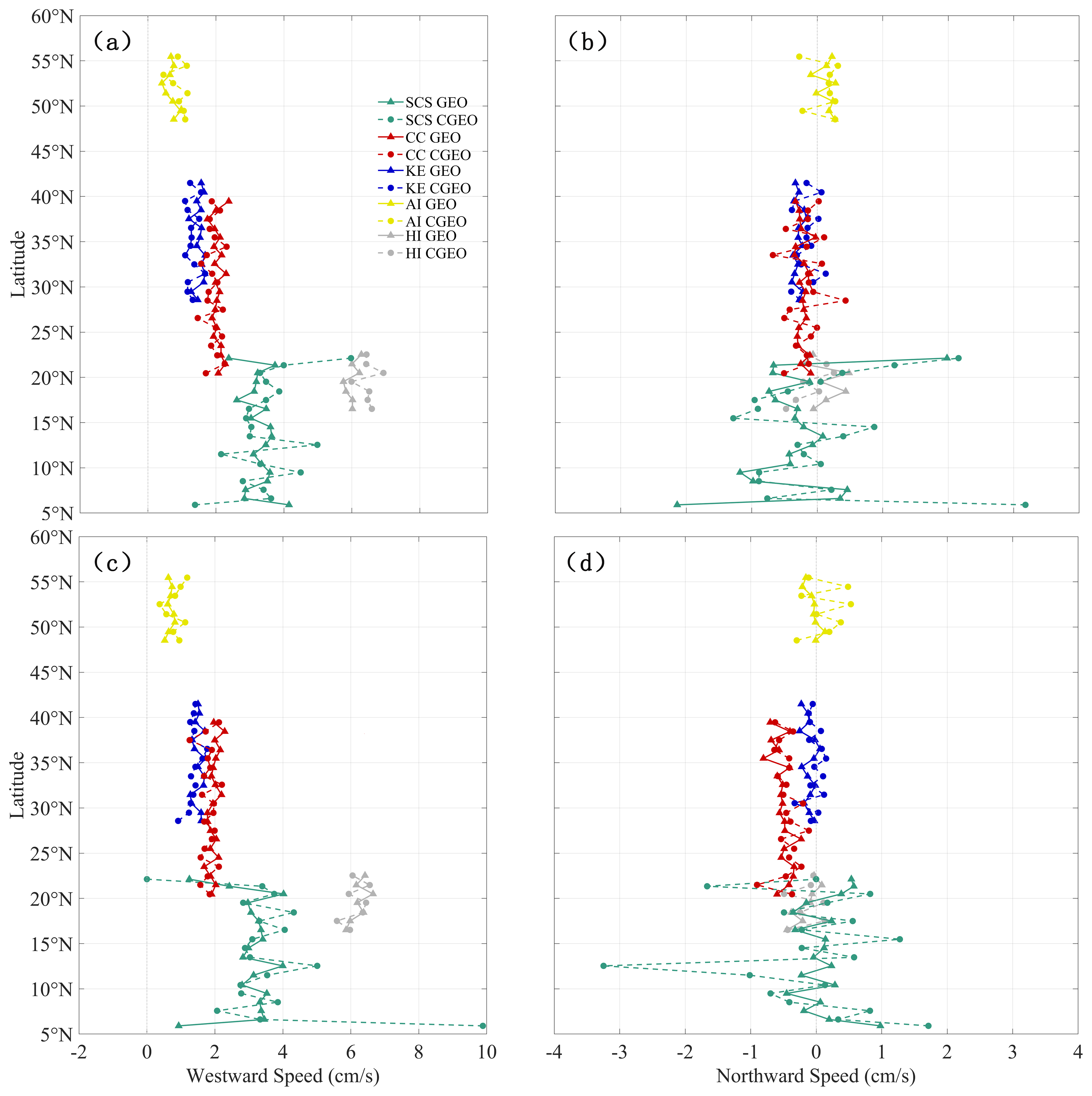Figure 12Latitudinal variations in the (a) zonal and (b) meridional speeds of CEs, and (c) zonal and (d) meridional speeds of AEs. Dashed and solid lines denote results from the CGEO and GEO balances, respectively.