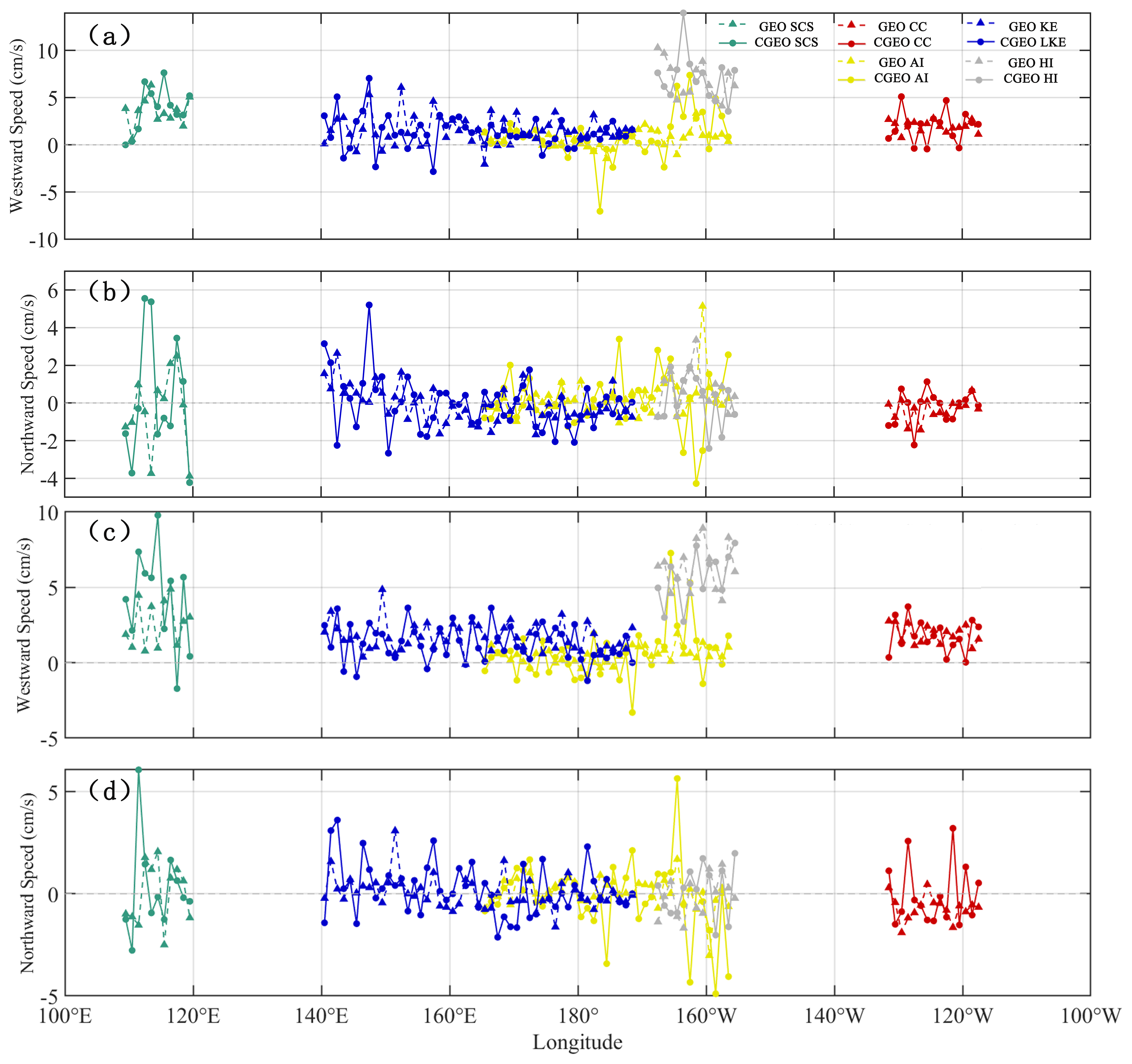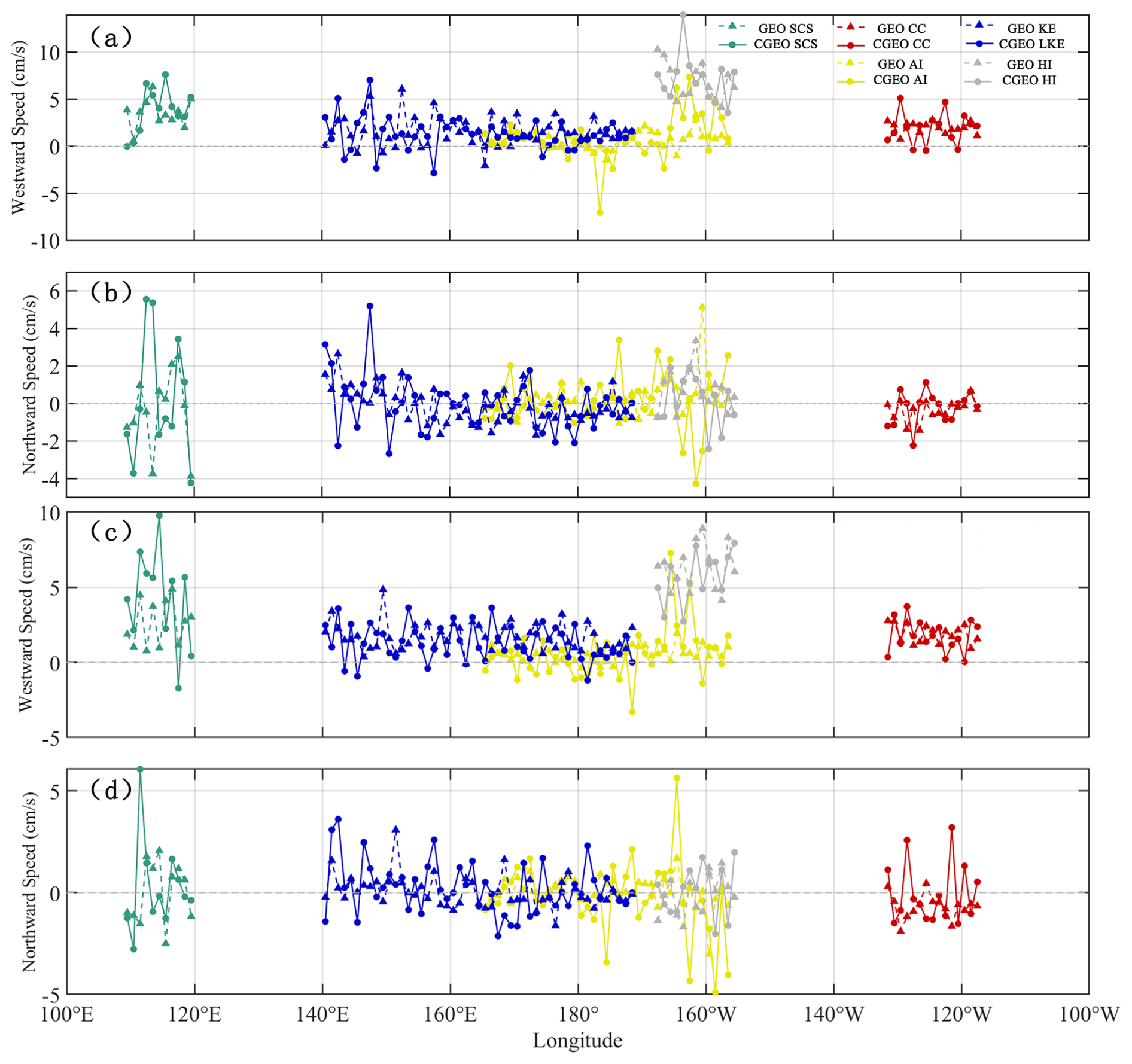 According to the meridional statistics, the speed variation of CGEO is more fluctuating than that of GEO (Fig. 13). Both CGEO and GEO eddies mainly move westward, with speeds ranging from 0–7 cm s−1. In the HI region, the westward speed is faster, ranging from 4–14 cm s−1, while AI, KE, and CC occasionally exhibit eastward fluctuations, with speeds under 3 cm s−1. In the AI region, the CE (AE) moves eastward around 176° W (171° W) in CGEO data, with a speed of around 7 cm s−1. The westward movement speed in the AI region around 165° W shows a large speed difference between the two datasets, with a difference greater than 5 cm s−1. In the SCS, the speed difference between the two datasets is significant around 103° E, exceeding 7 cm s−1. For CGEO-CE, the northward speed variation is large in the SCS region around 102° E, the western KE, and the eastern AI region, with northward and southward speeds reaching about 5 cm s−1. In other regions, the speed fluctuations remain within the range of −2 to 2 cm s−1. For CGEO-AE, the northward speed variation is also large in the SCS region around 102° E, the western KE, and the eastern AI region, but the maximum values in the SCS and AI regions are higher than those for CE, while the maximum value in KE is smaller than that for CE. The data correction has a greater impact on AE than on CE, with the speed difference in the northward movement for AE being noticeably larger than that for CE in both datasets.