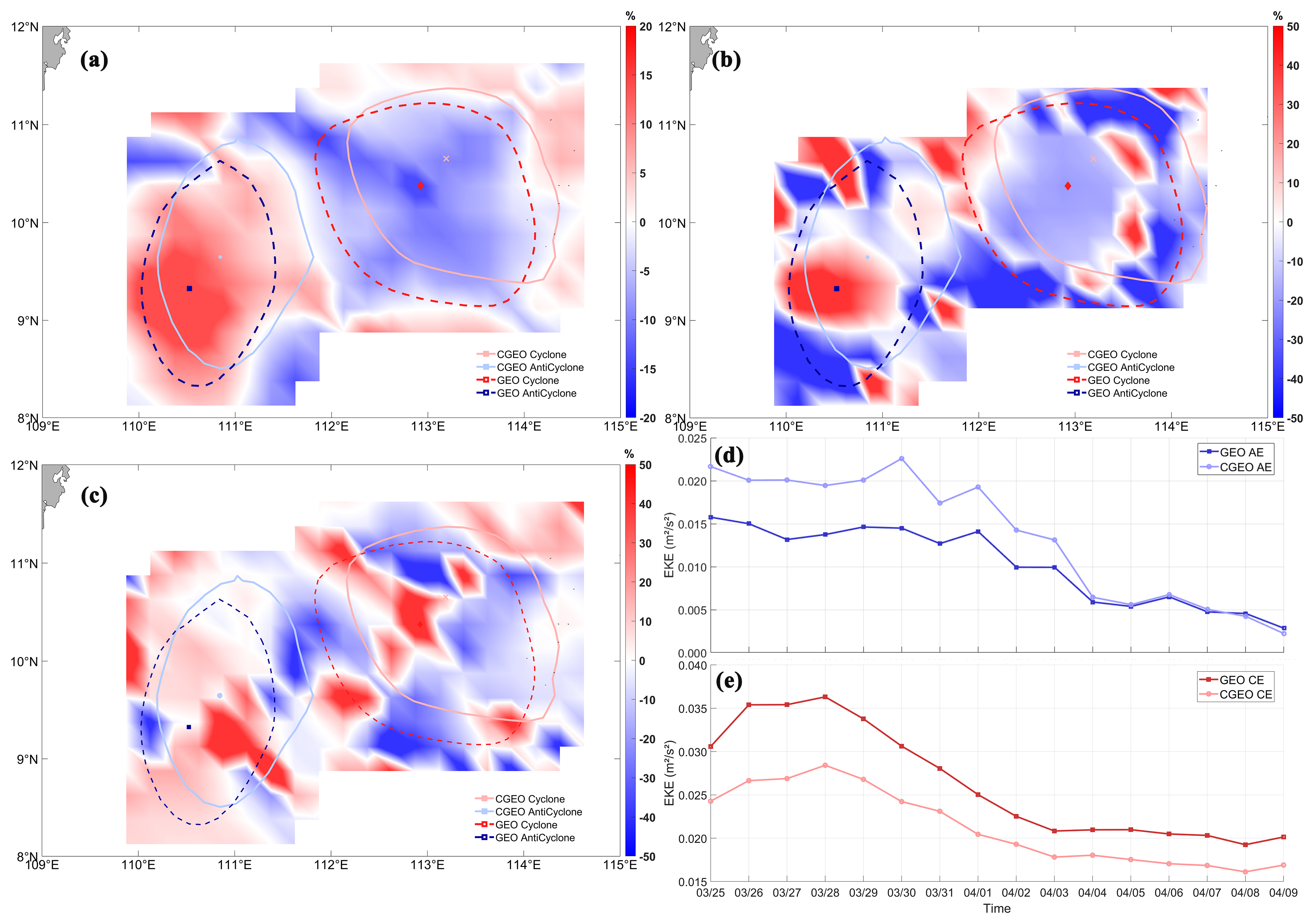 Figure 15Snapshot of CE and AE cases in the SCS (25 March 2018): (a) Percentage difference between CGEO and GEO velocity; (b) Percentage difference between CGEO and GEO enstrophy; (c) Percentage difference between CGEO and GEO strain rate; (d) Evolution of EKE for a selected AE under CGEO and GEO balance (25 March–9 April 2018); (e) Evolution of EKE for a selected CE under CGEO and GEO balance (25 March–9 April 2018).