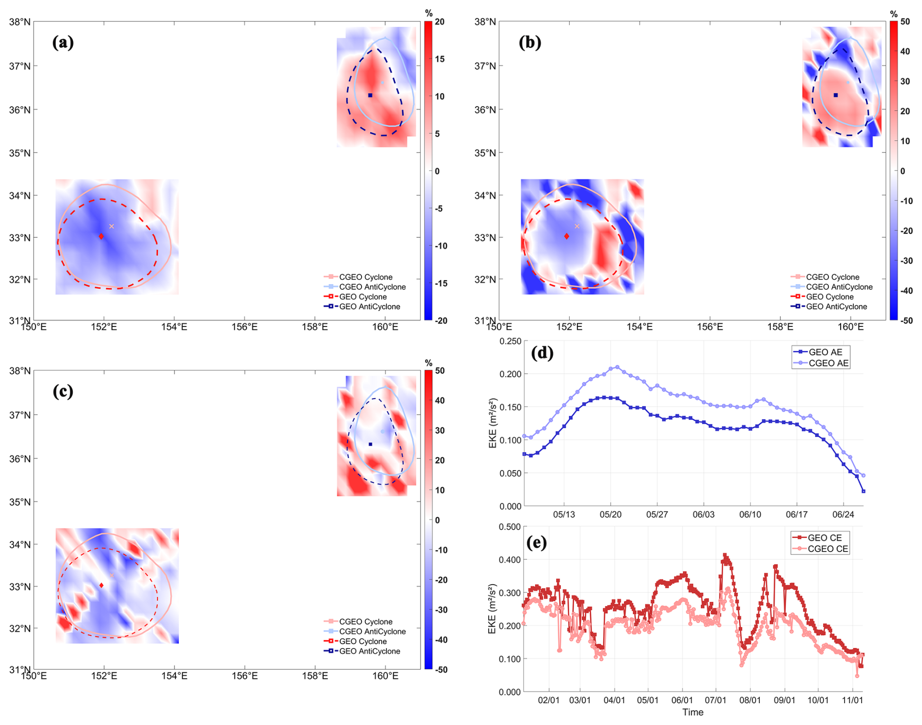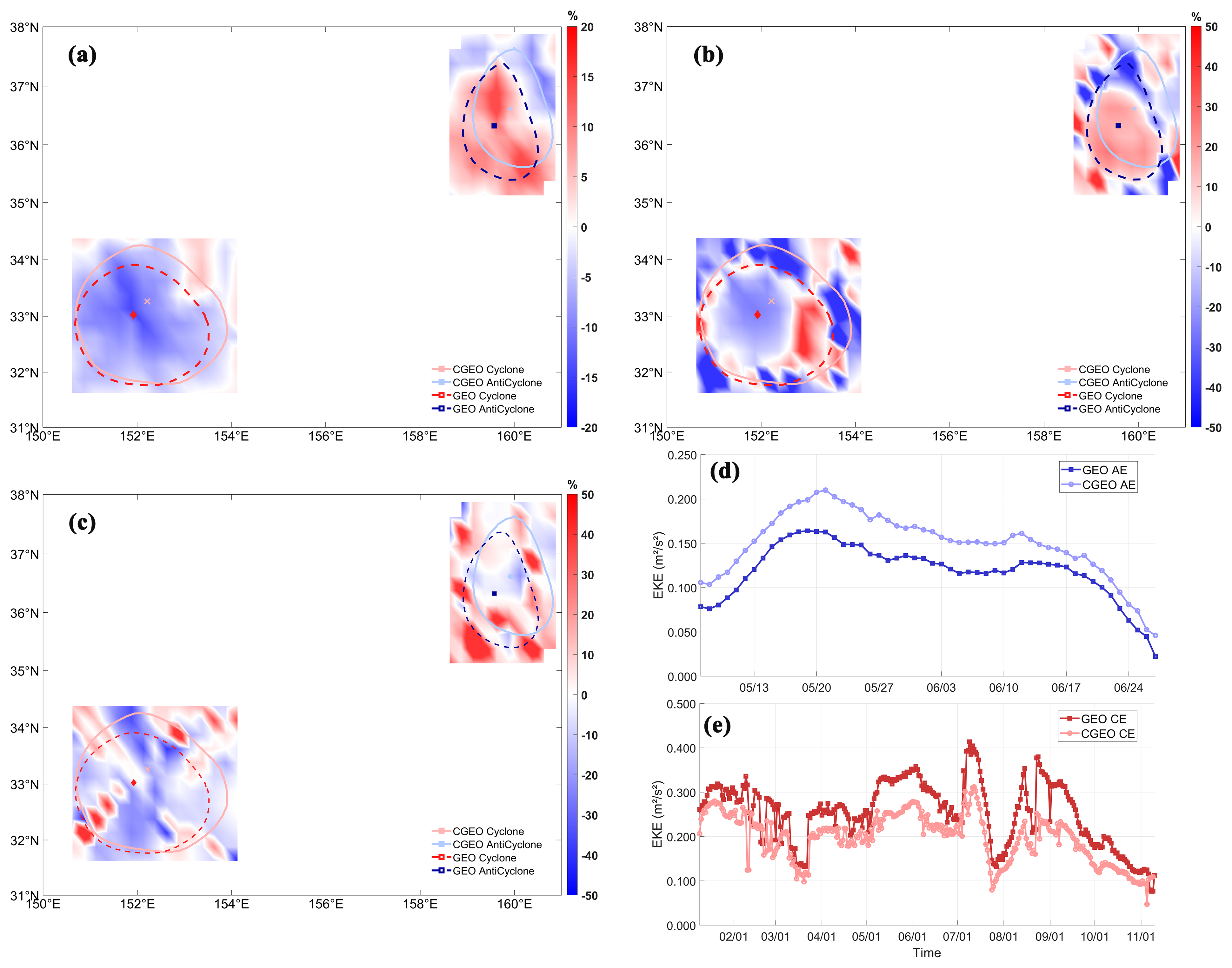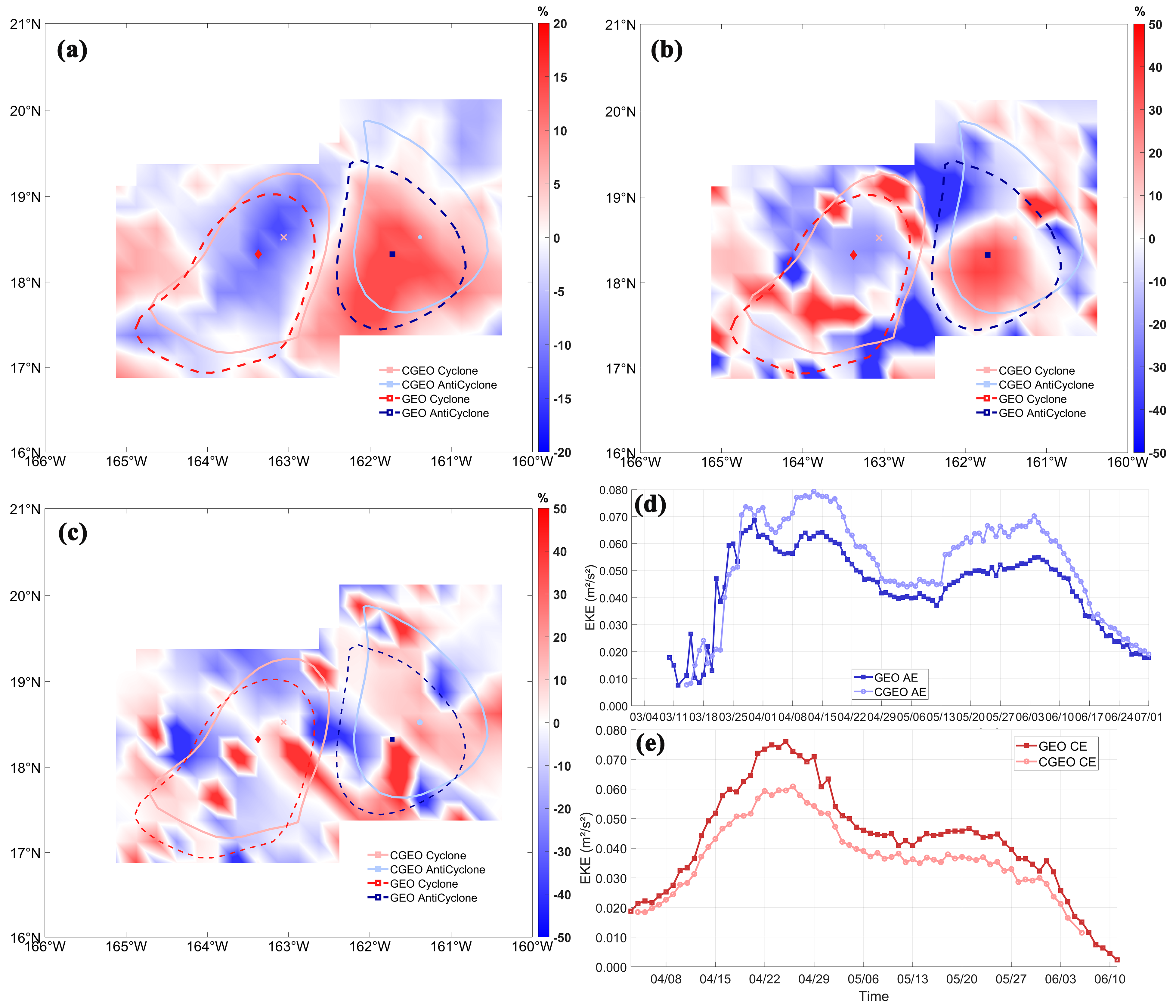 Figure 17Snapshot of CE and AE cases in the HI region (25 May 2018): (a) Percentage difference between CGEO and GEO velocity, (b) Percentage difference between CGEO and GEO enstrophy, (c) Percentage difference between CGEO and GEO strain rate; (d) Evolution of EKE for a selected AE under CGEO and GEO balance (10 May–1 July 2018), (e) Evolution of EKE for a selected CE under CGEO and GEO balance (4 April–1 June 2018).