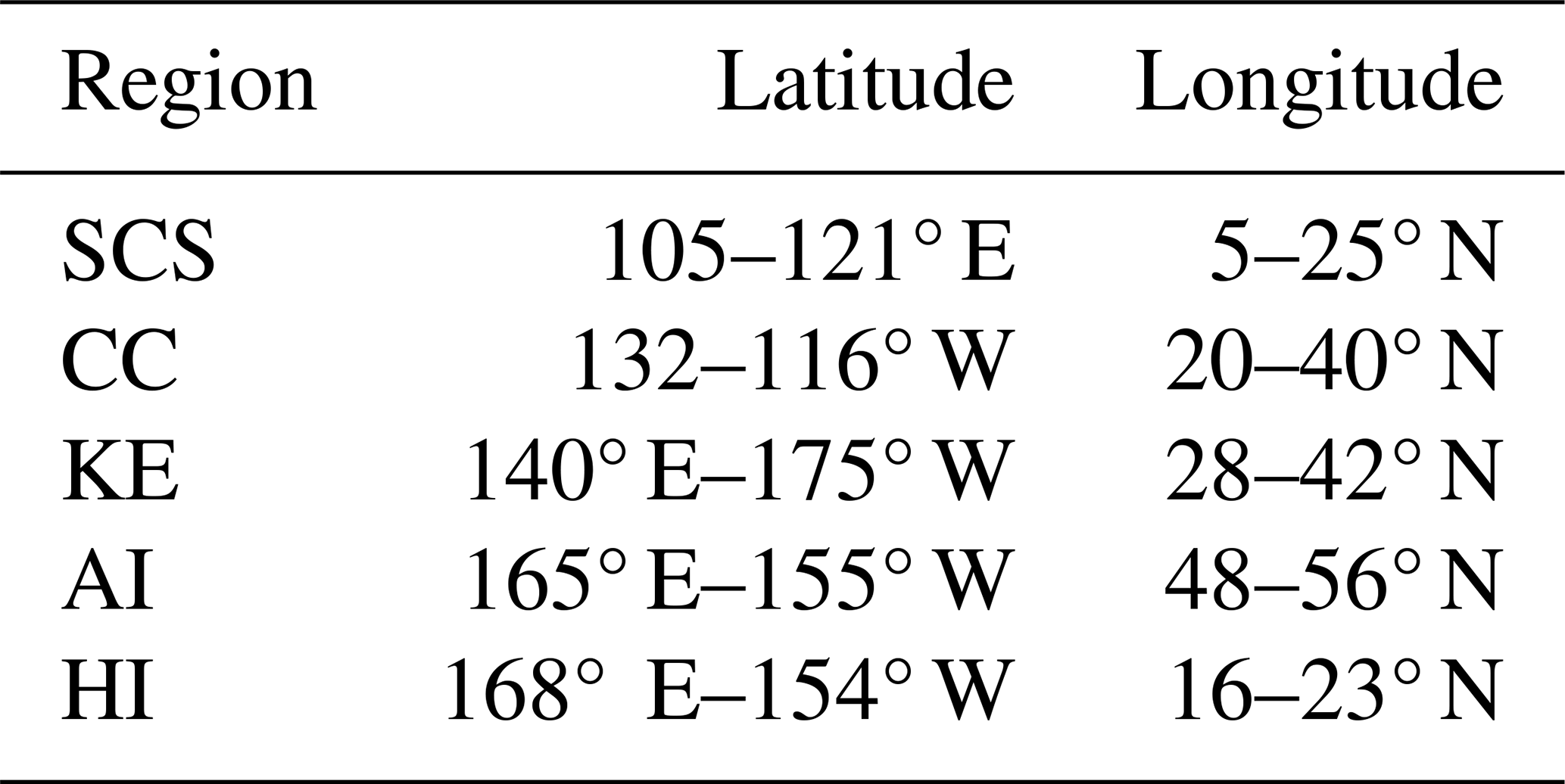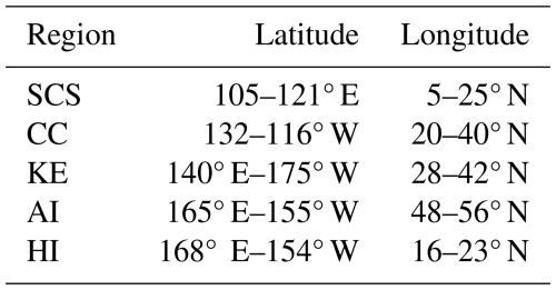 The EKE is an important parameter for characterizing eddy activity and serves as a key indicator for understanding the multi-scale dynamics of eddies. Cao et al. (2023) demonstrated that EKE after cyclogeostrophic adjustment exhibits marked differences across three distinct marine environments: low-latitude regions, eddy-rich zones with intense eddy-eddy interactions, and strongly curved frontal systems. Figure 1a depicts the spatial distribution of the normalized difference between the multi-year mean geostrophic and cyclogeostrophic EKE in the North Pacific from January 1993–December 2018. Based on this spatial pattern, five regions exhibiting the most pronounced differences were selected for detailed analysis: the South China Sea (SCS), the California Coastal Current (CC) region, the Kuroshio Extension (KE), the Aleutian Islands (AI), and the Hawaiian Islands (HI). The precise geographical boundaries of these regions are provided in Table 1.